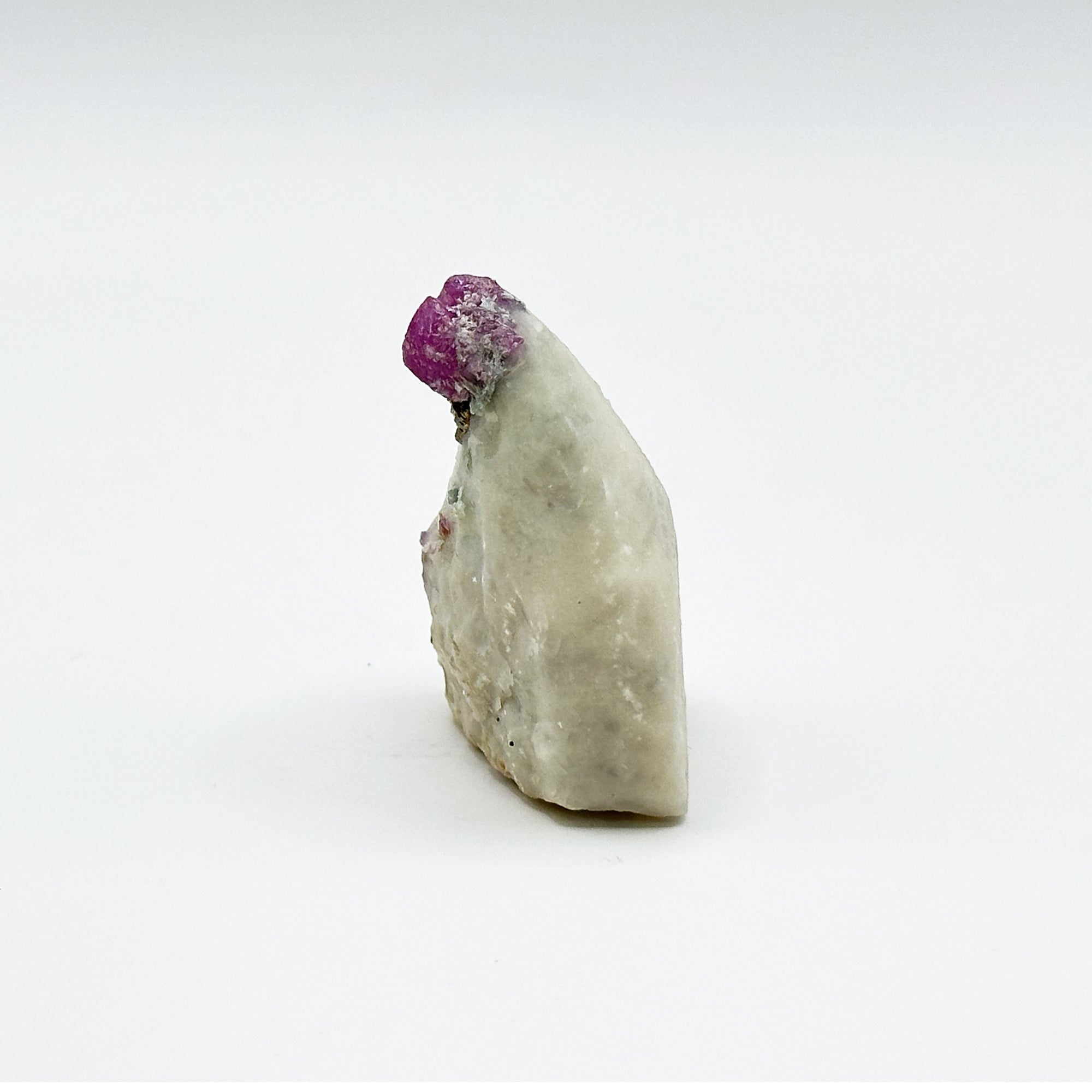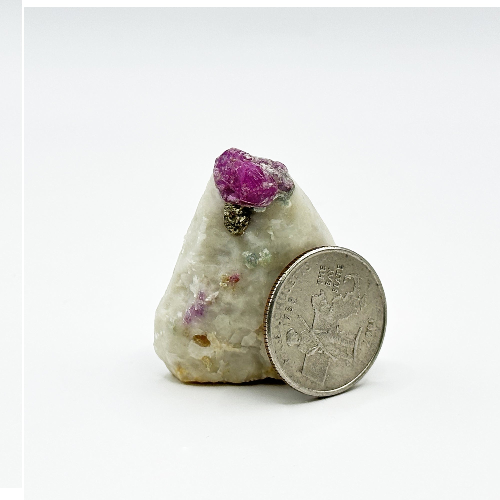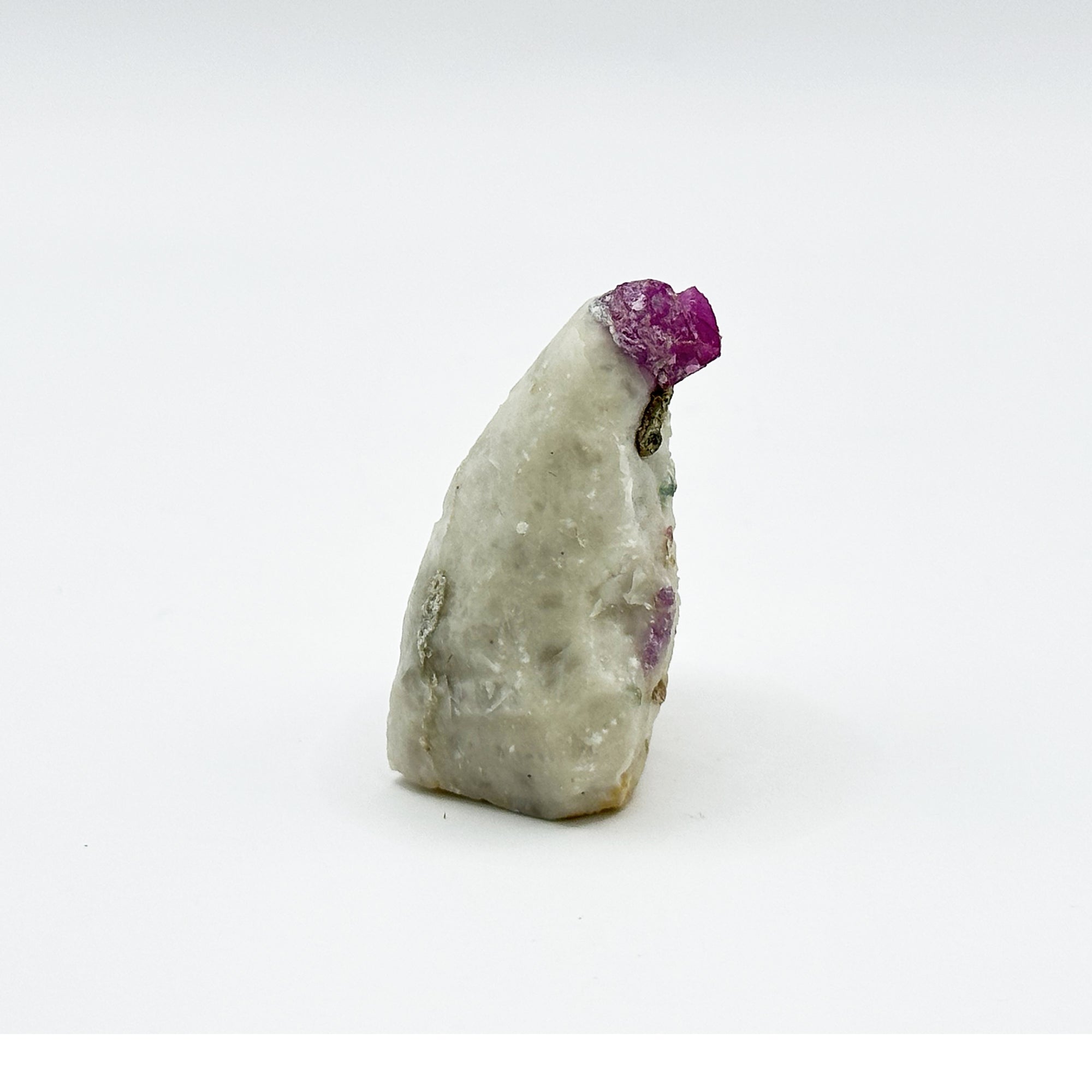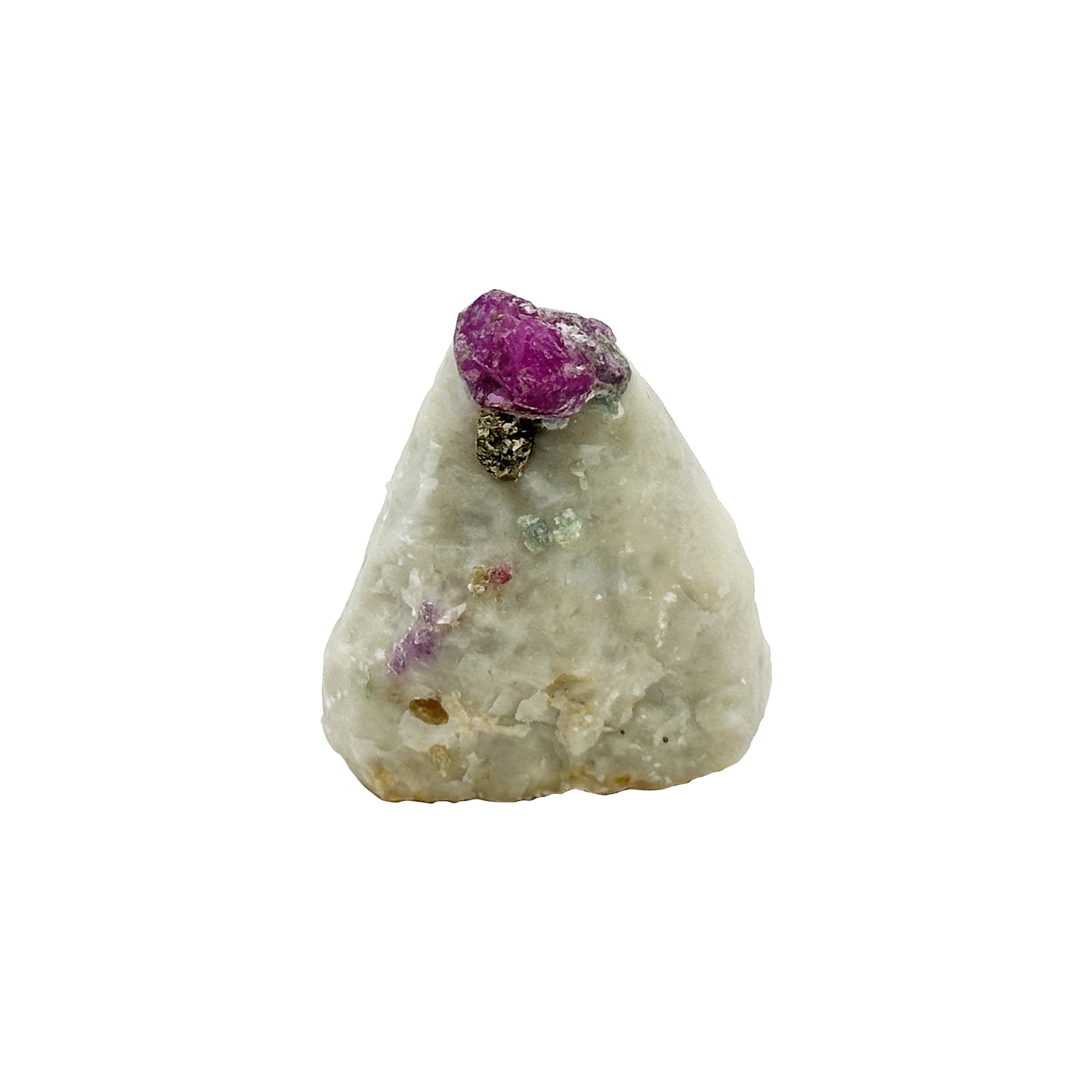 This natural Ruby specimen from Pakistan showcases deep red to pinkish red hues with a raw, unpolished charm that highlights its natural formation. Part of the corundum family and rubies are known for their durability and vibrant color. This piece contains an approximate height of 1.5” with an approximate weight of 1.3oz, making it a perfect addition to any home or collection!