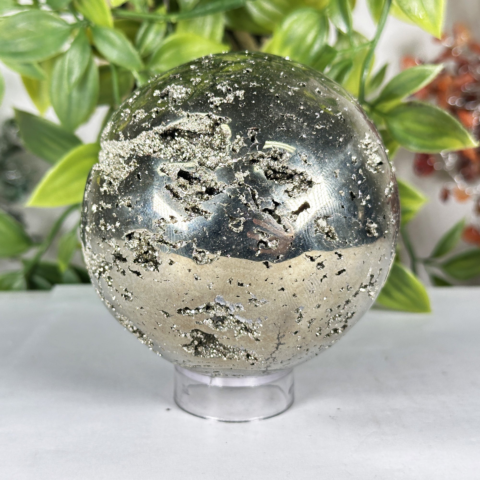 Perfect for crystal healing, meditation, or decorative display, this Pyrite sphere is believed to promote vitality, confidence, and abundance. Its natural Druzy crystals add a unique, sparkling dimension, making it a captivating focal point. The smooth, polished surface allows for easy handling and energy work, appealing to collectors and spiritual practitioners seeking a powerful, natural crystal.