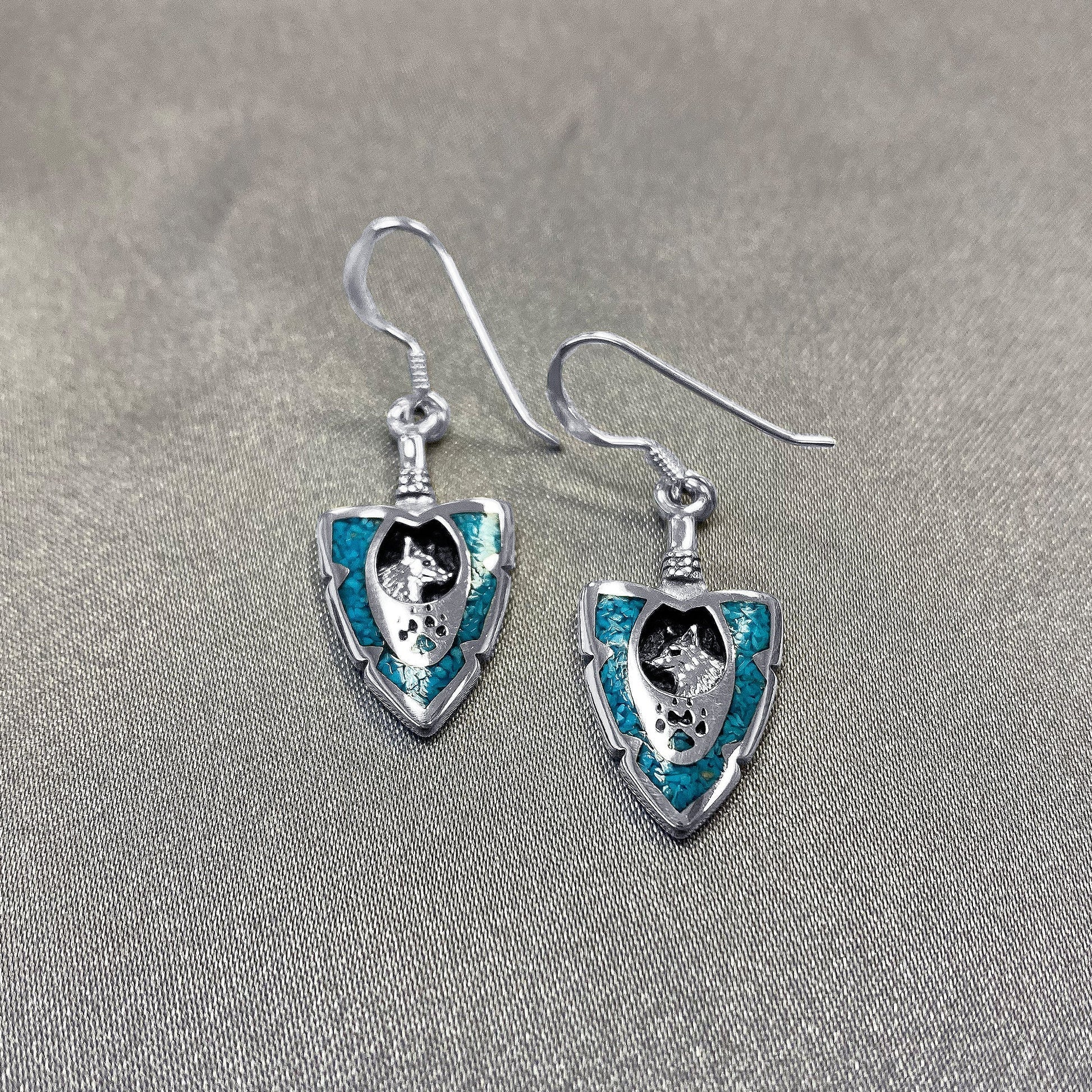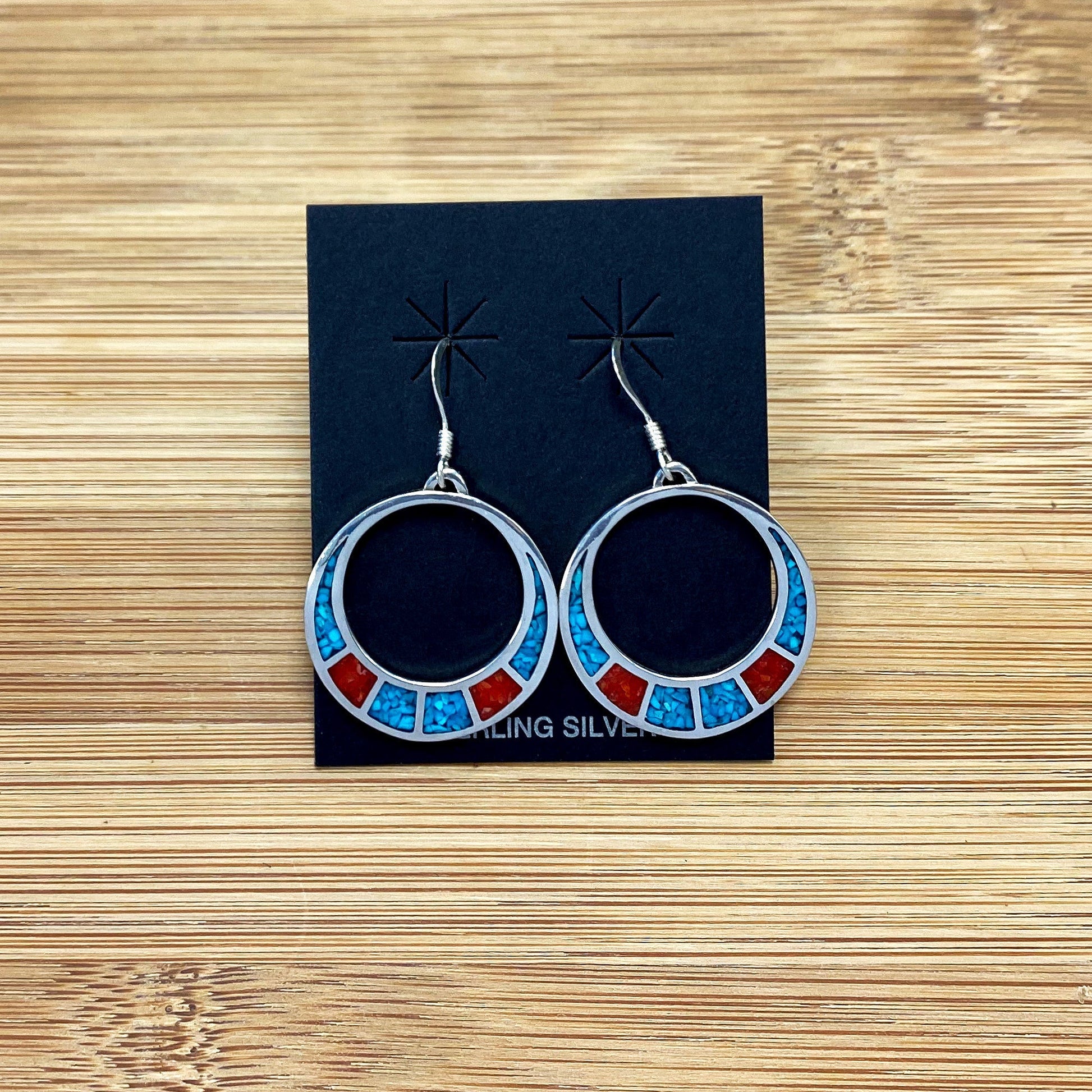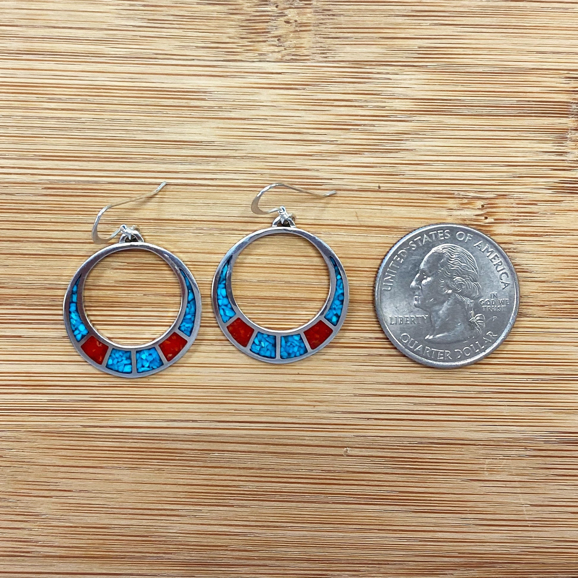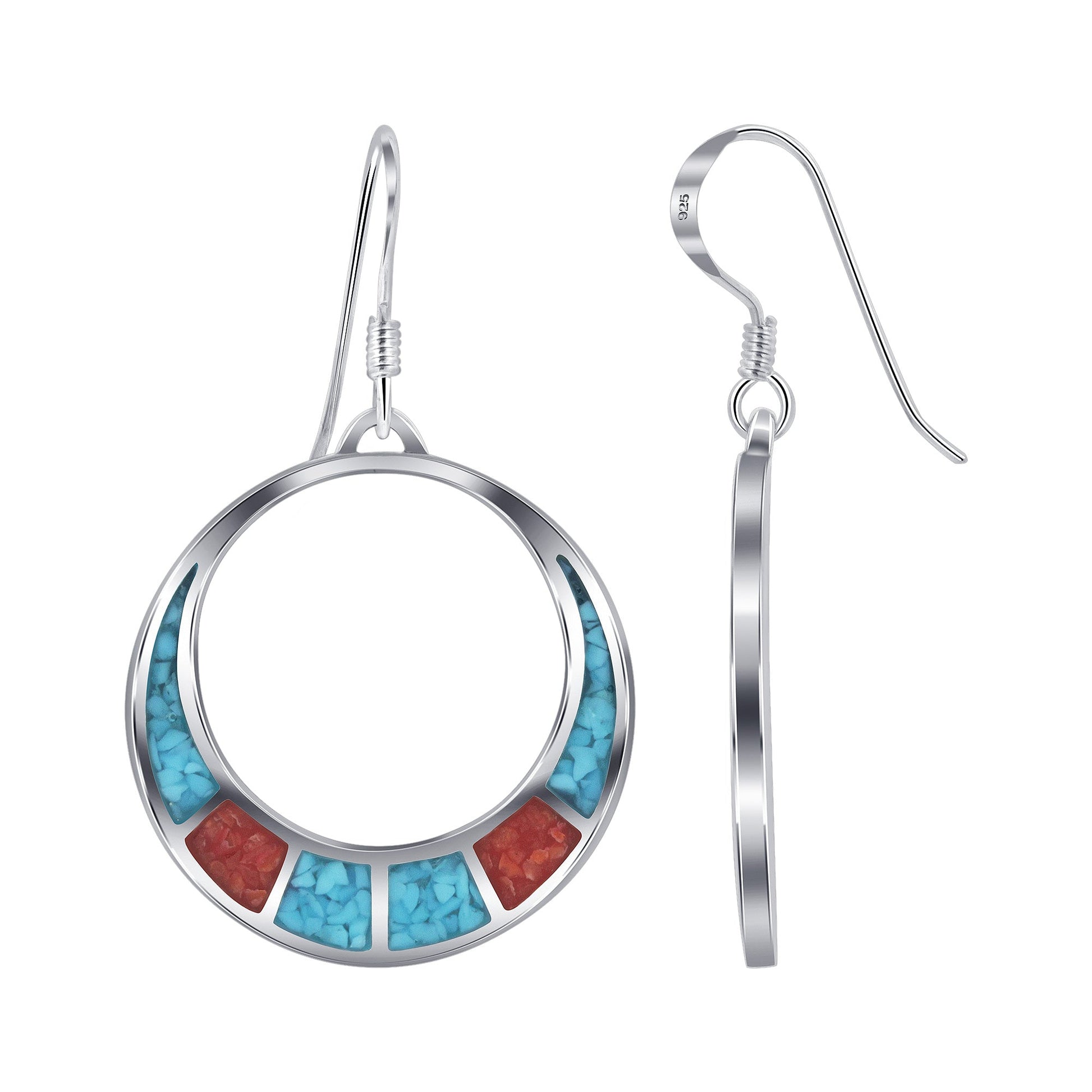 .925 Silver Hoop Shape Drop Earrings with Turquoise and Coral Inlay