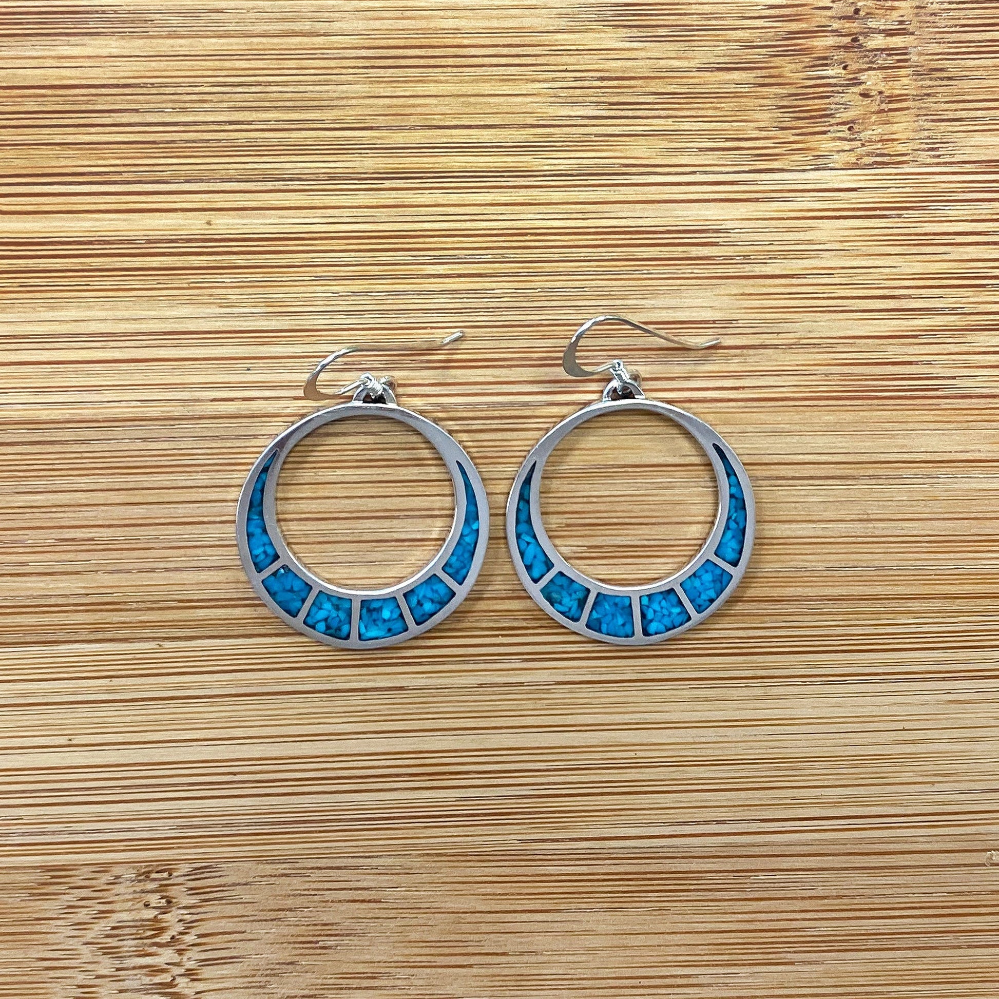A beautifully designed blue turquoise and coral gemstone inlay hoop-shaped women's earring featuring sterling silver is perfect for any Southwestern look.