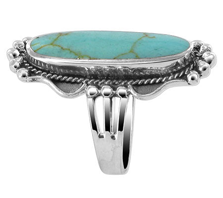 This 925-sterling silver ring contains an elongated oval composed of reconstituted turquoise with a vibrant sea-bluish green shade. Surrounding the stone is a rope-like design along with silver beads adorning the top, bottom, as well as sides. The classic design found on the ring is sure to beautifully complement almost any ensemble as well as look flattering on just about any finger. We offer a variety of sizes in order for you to find your perfect fit!.