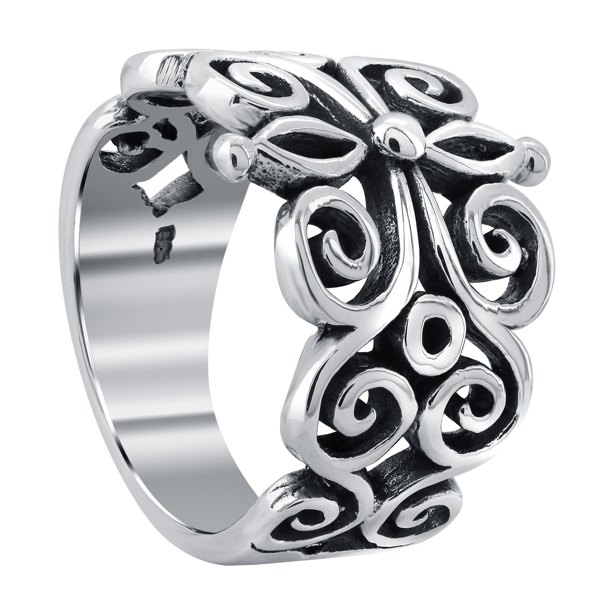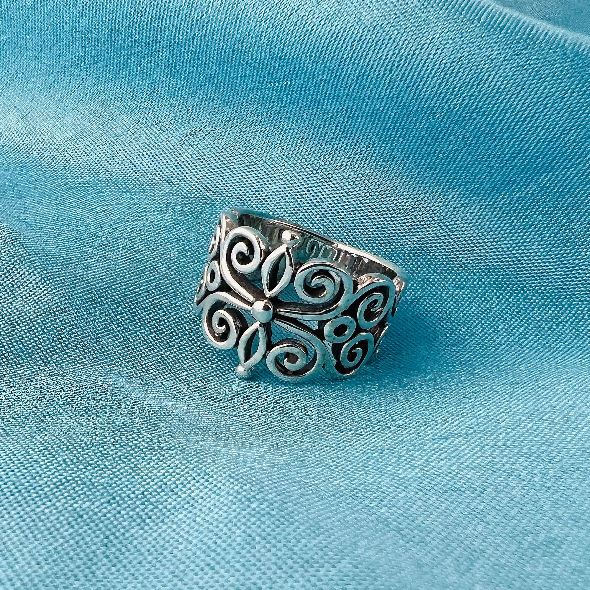 This is a beautiful sterling silver ring with a floral filigree design. The ring is made of 925 sterling silver and has a vintage look. It's perfect for everyday wear and makes a great gift for loved ones. A timeless piece of elegance and luxury that is sure to be treasured for years to come. Rejoice in the beauty and craftsmanship of this unique creation.