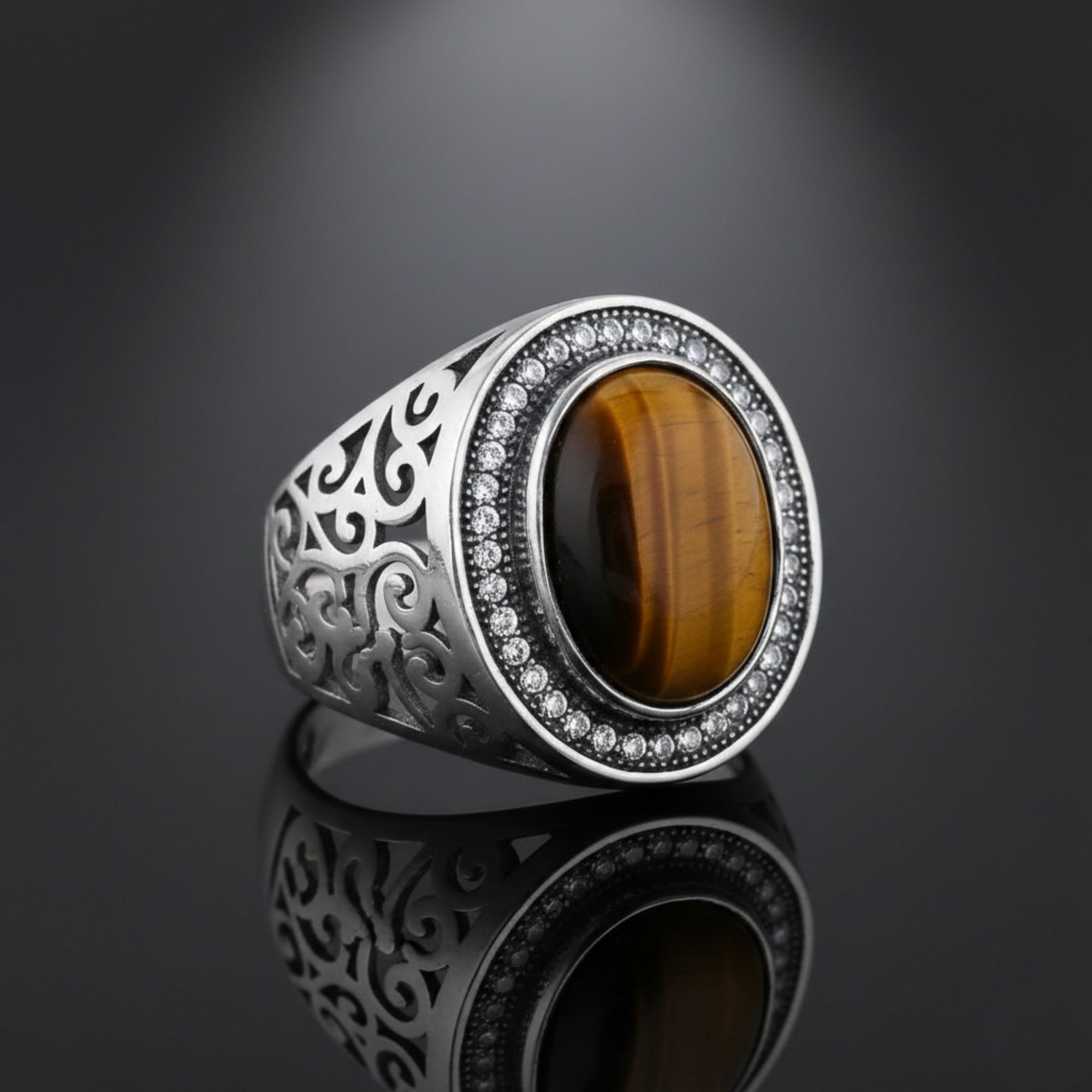 Crafted with premium 925 Sterling Silver, this ring weighs 6.16 grams, making it a lightweight and comfortable piece of jewelry. The centerpiece is a captivating oval Tiger Eye gemstone, known for its unique banded patterns and warm, earthy tones.