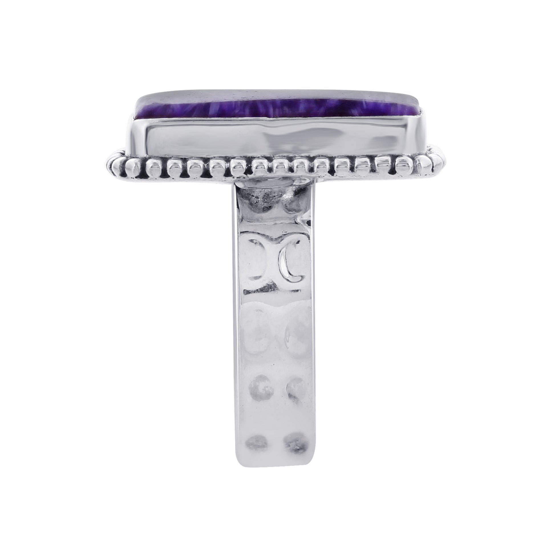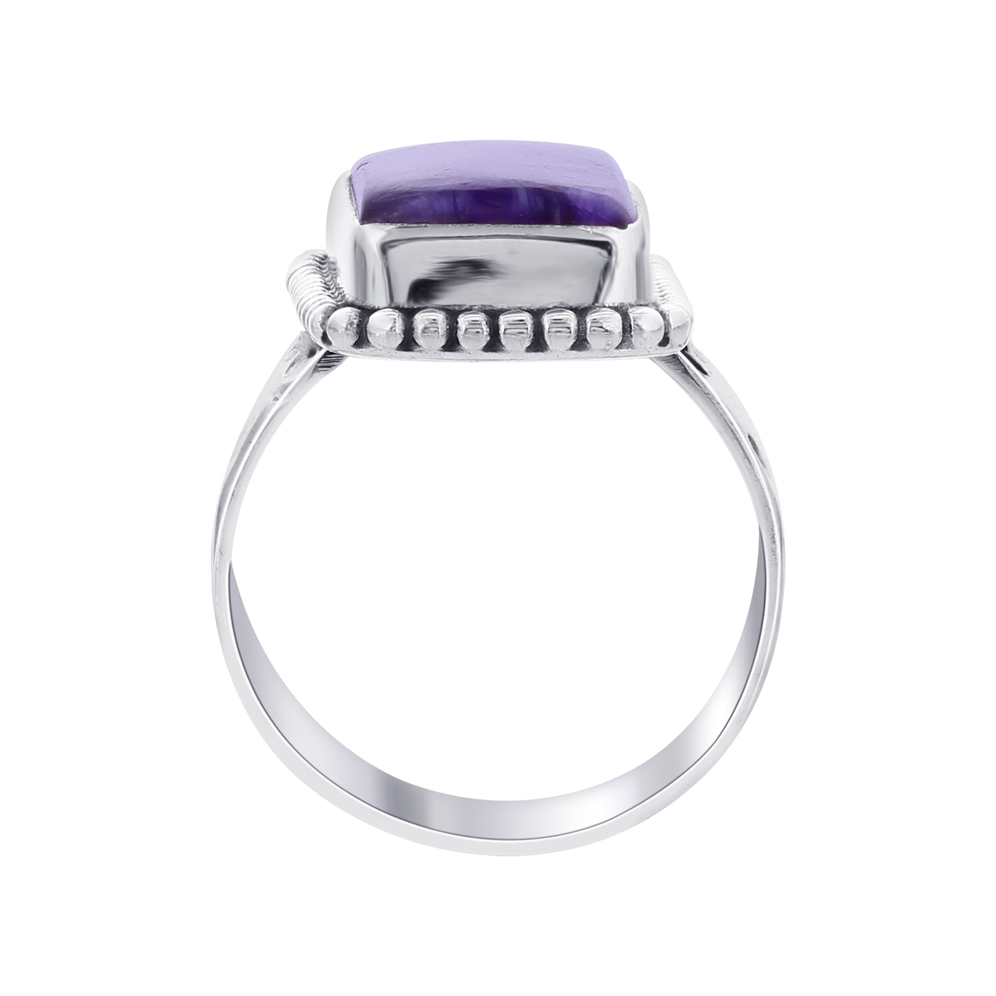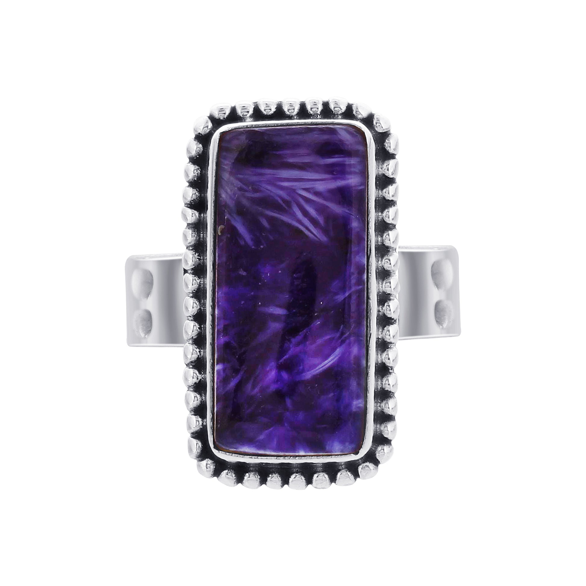 Crafted with 925 Sterling Silver, this exquisite ring weighs 11.45 grams, ensuring durability and a polished finish. It features a rectangular Charoite gemstone, a rare and captivating mineral known for its unique purple color and swirling patterns.