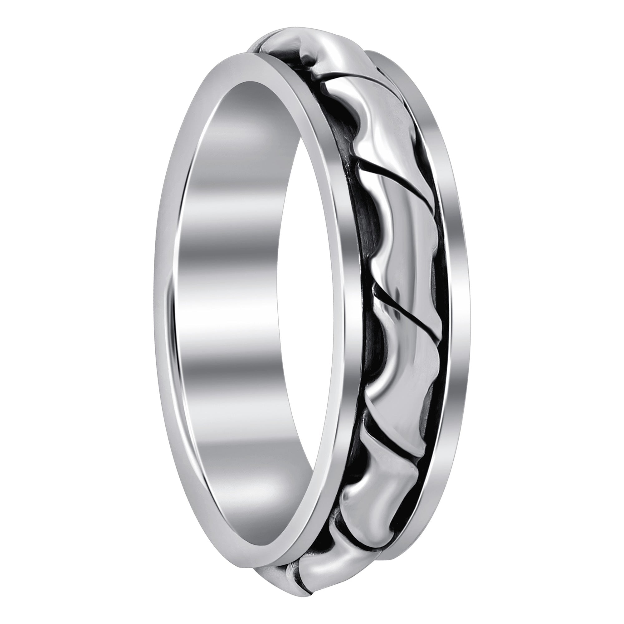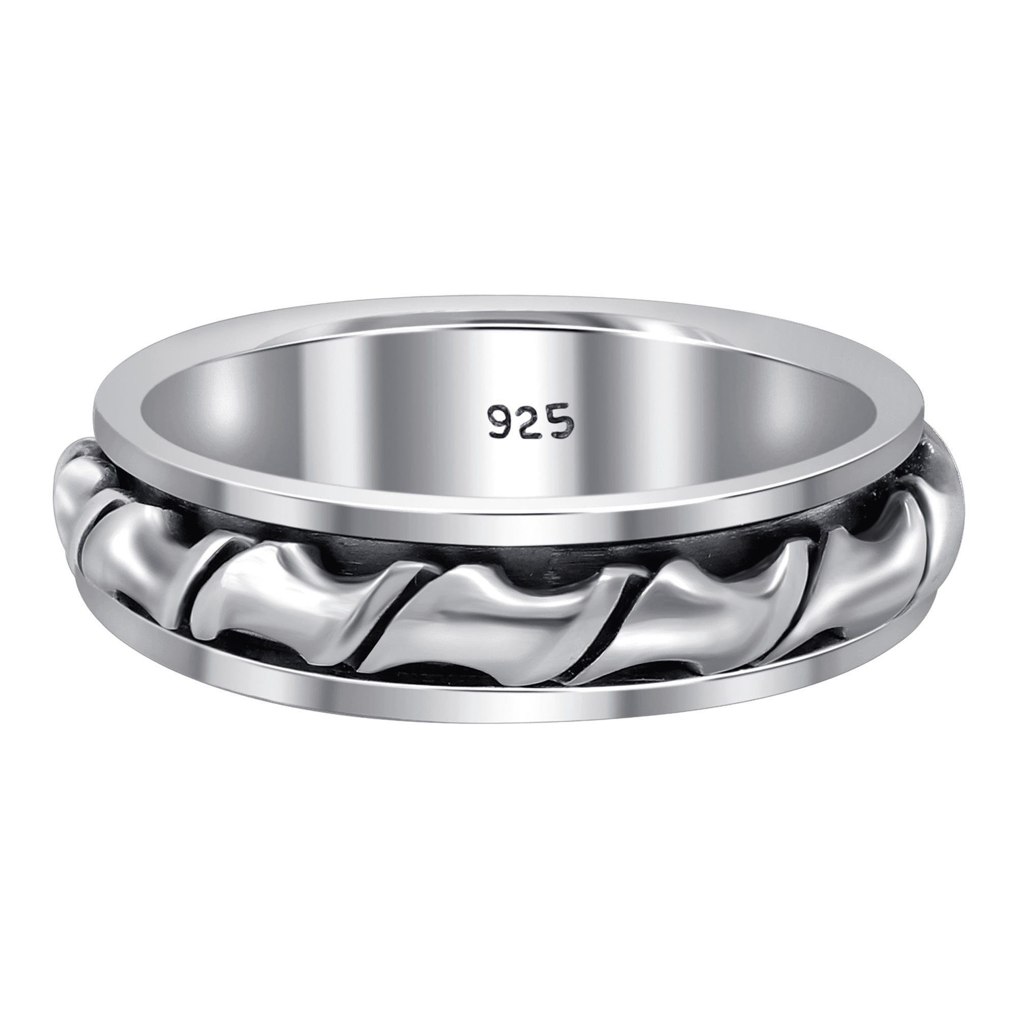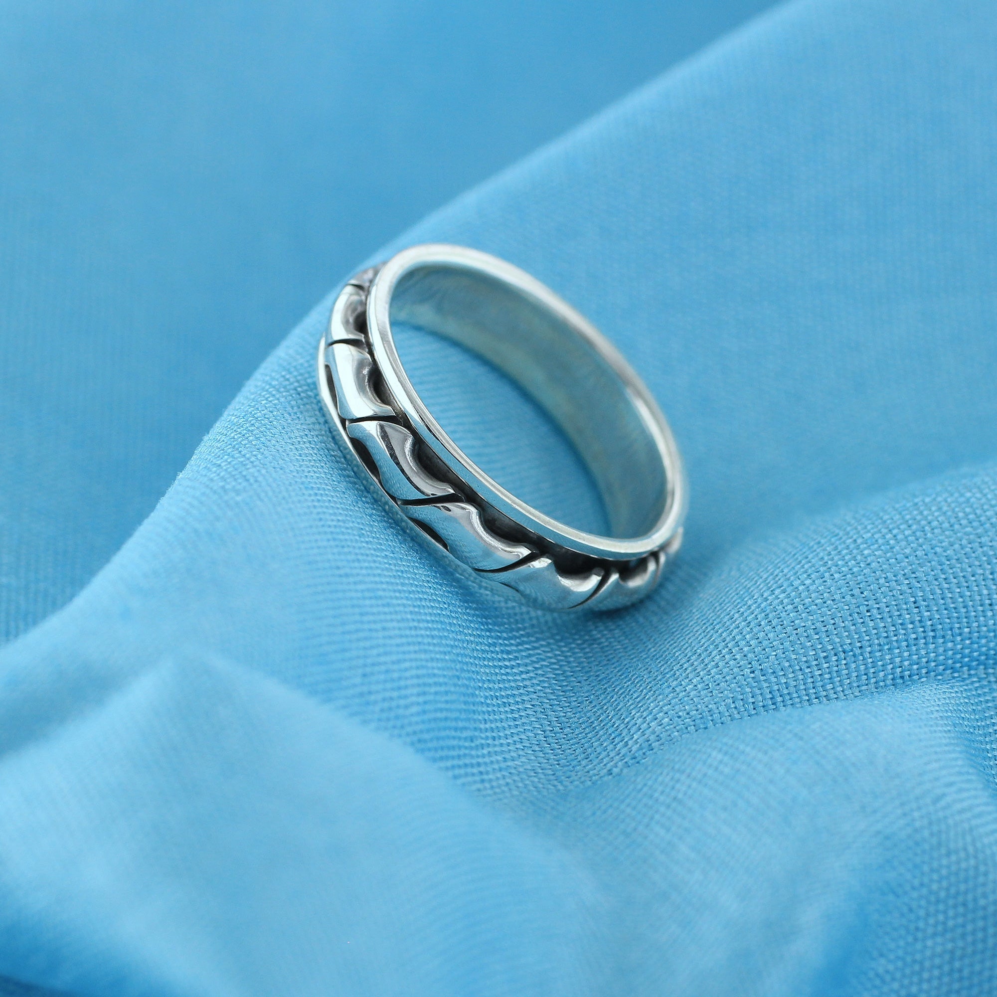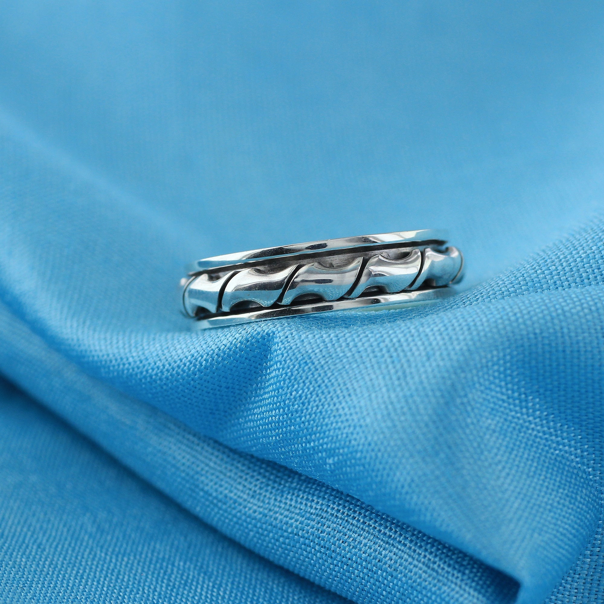 This unique sterling silver spinner band fidget ring is perfect for anyone who loves spinning jewelry. The band is made of 925 sterling silver and features a beautiful blaze design. The spinner ring is easy to spin and makes a great addition to any jewelry collection.