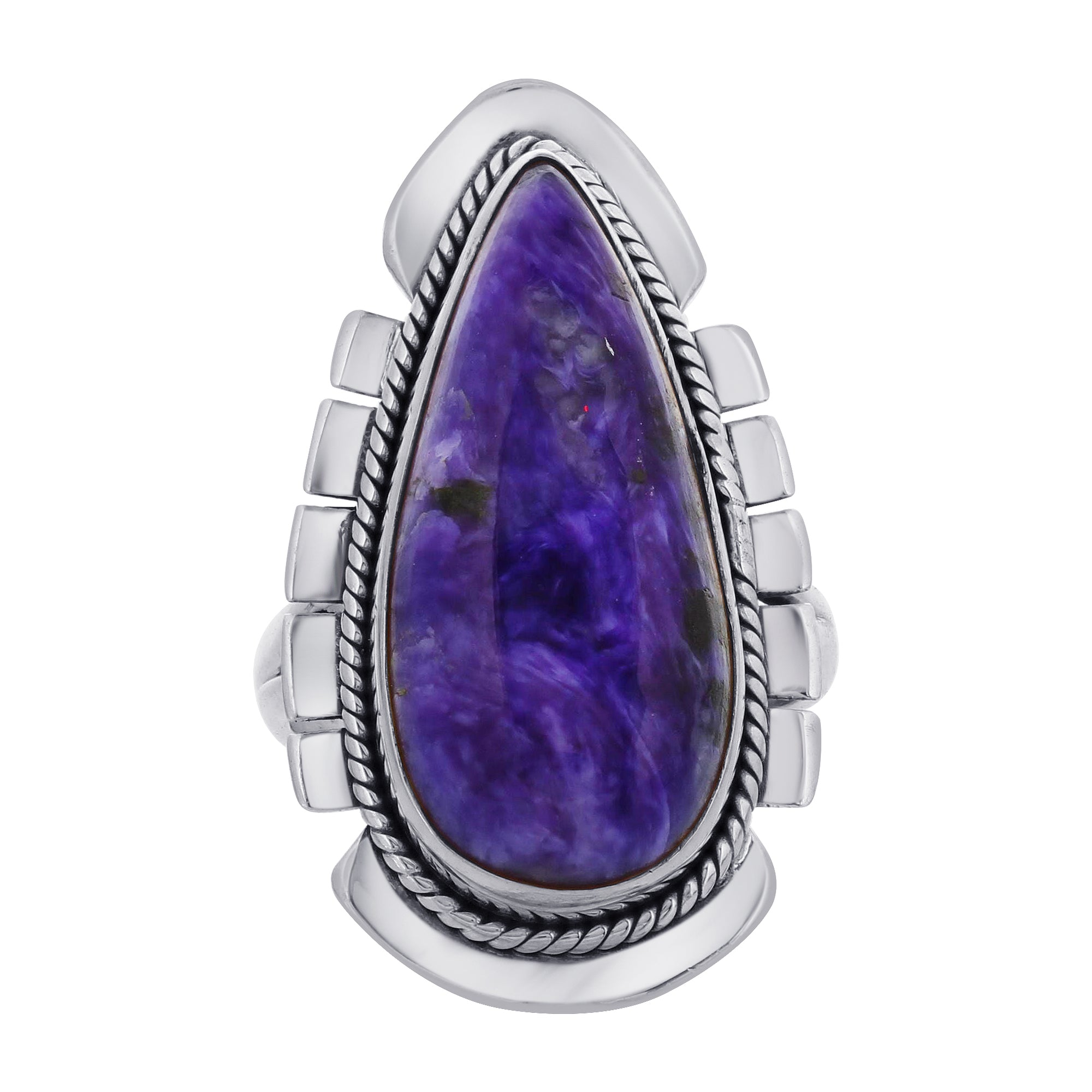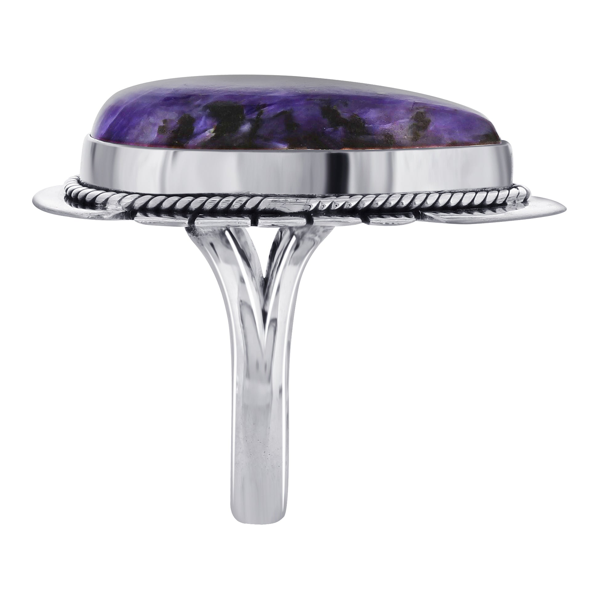 Crafted with 925 Sterling Silver, this teardrop charoite gemstone ring is a stunning piece of jewelry. It weighs 15.46 grams, offering a substantial feel on your finger.