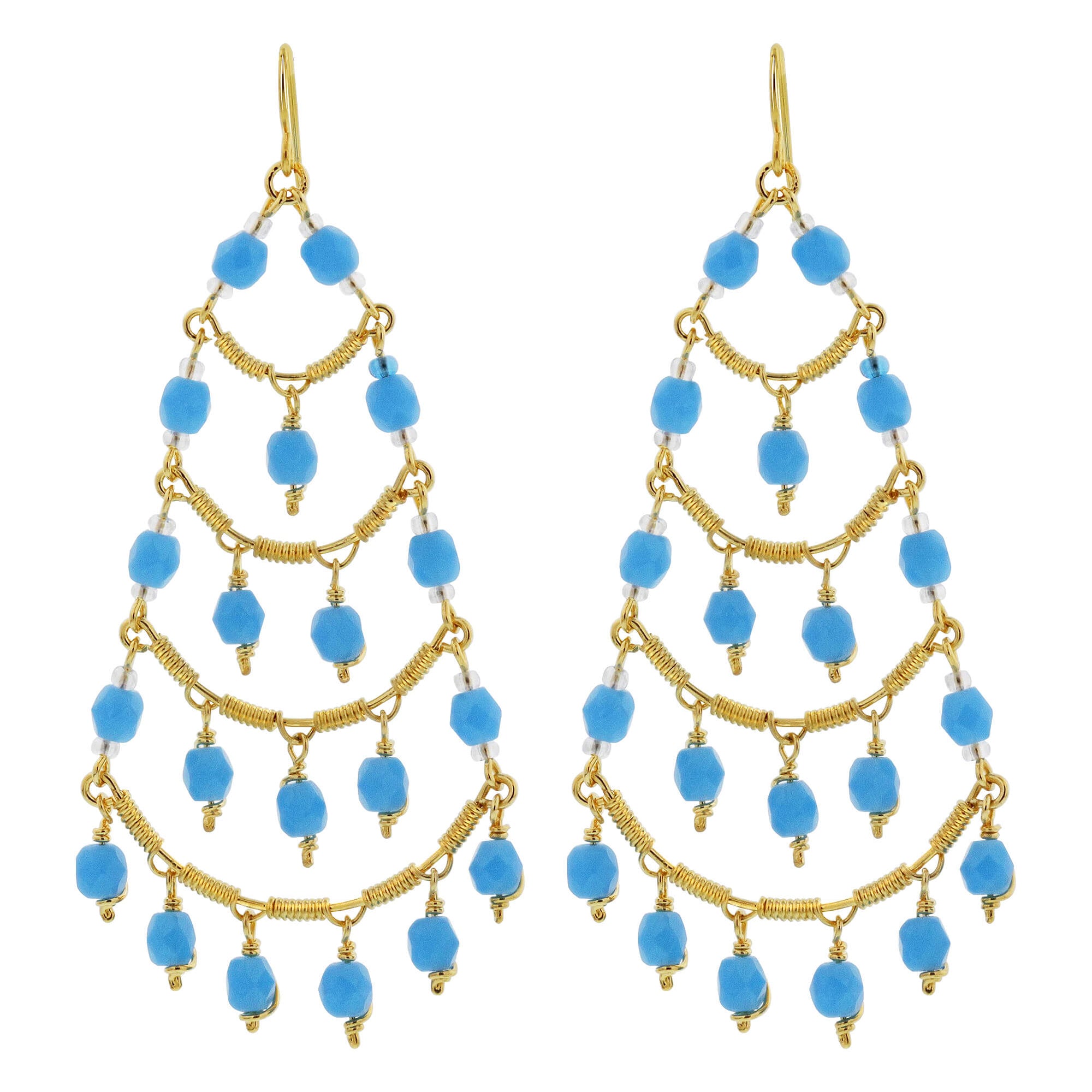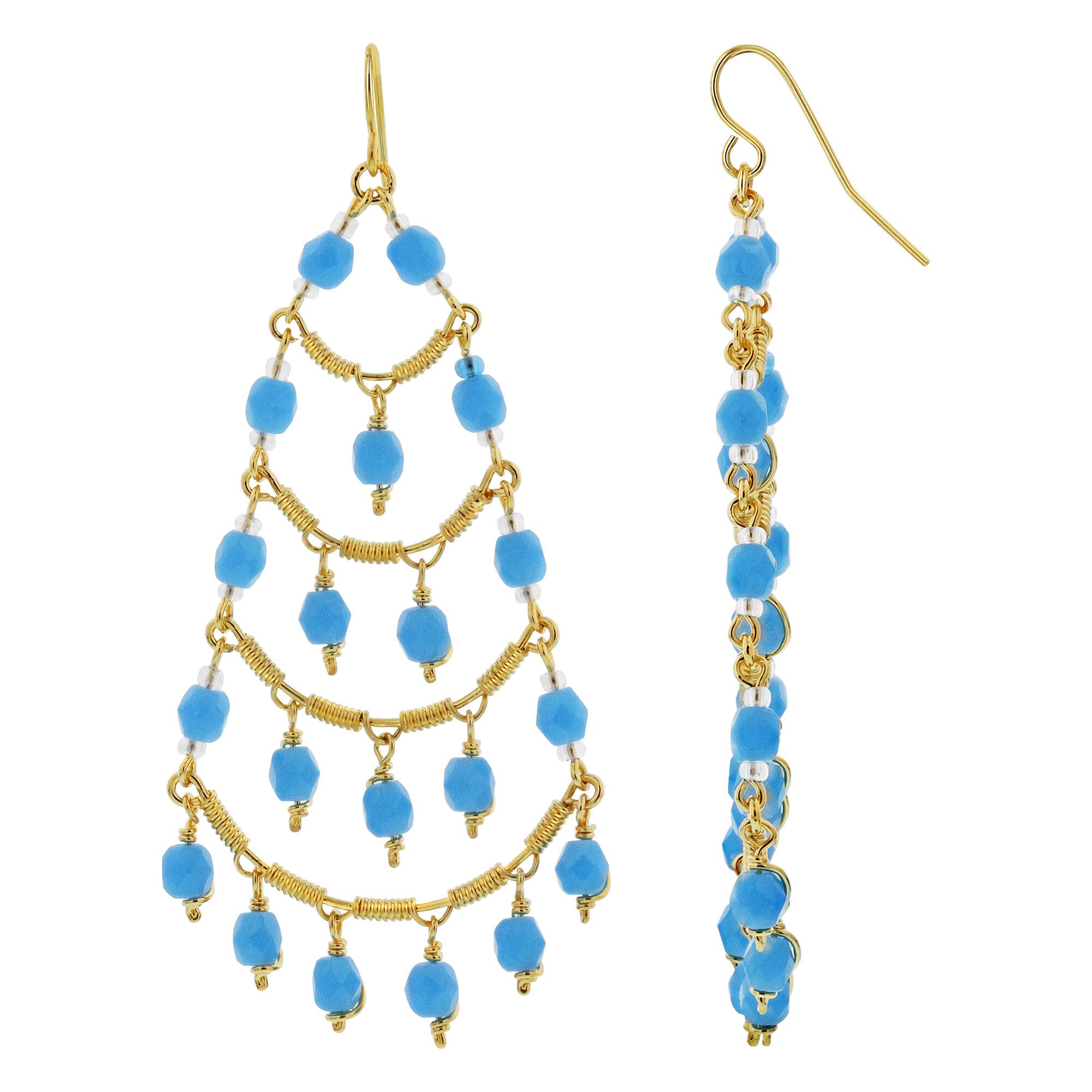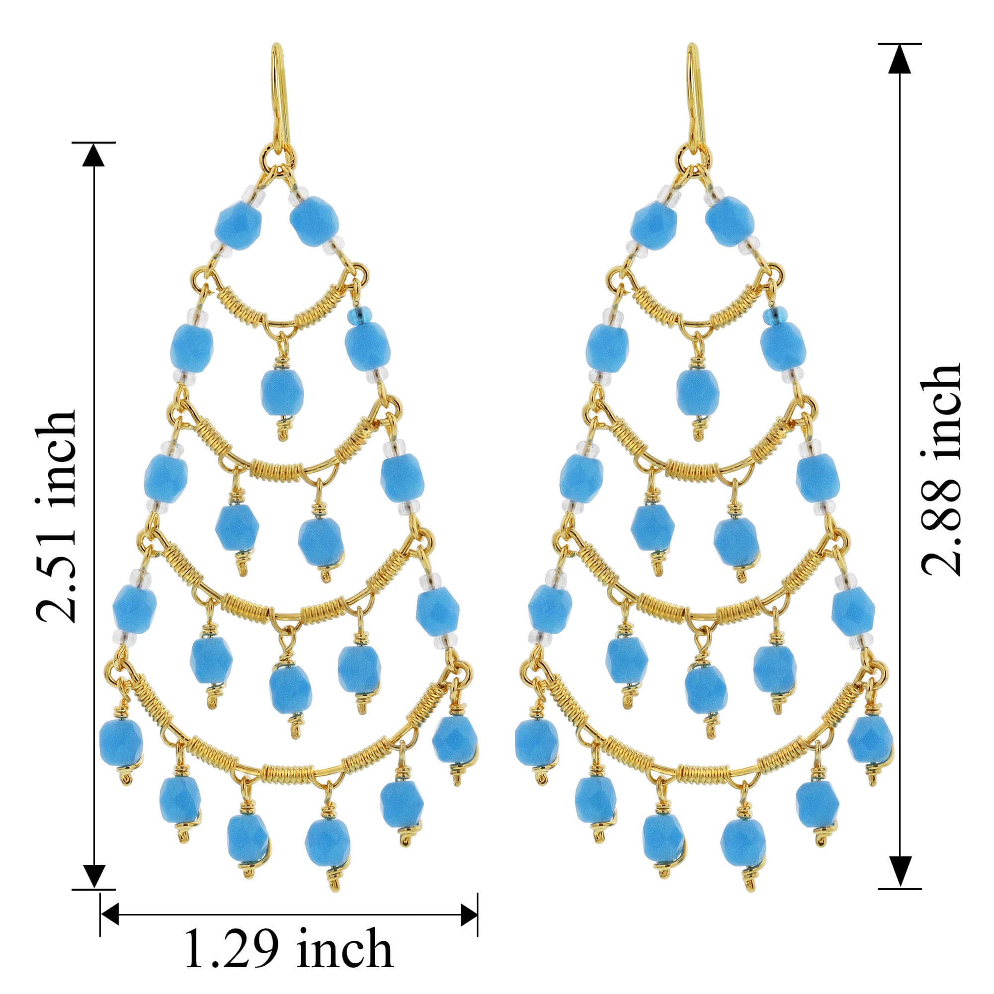 Stainless Steel 1.29 x 2.88 Inch Chandelier Earrings. Brazilian Czech seed aquamarine color beads French wire hook chandelier earrings. These earrings feature a unique and sophisticated design that can be dressed up or down, making them perfect for any occasion. The gold plating adds a warm, classic finish, while the stainless steel ensures a long-lasting, durable product.