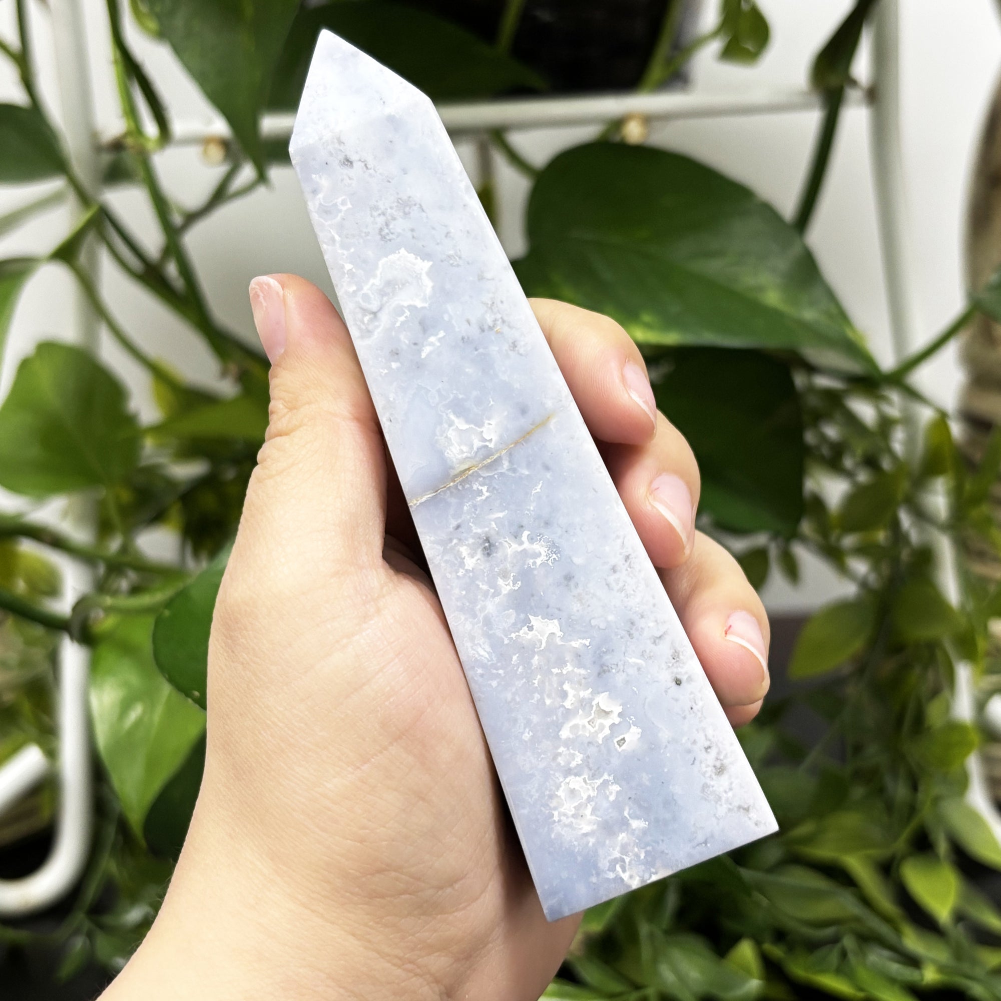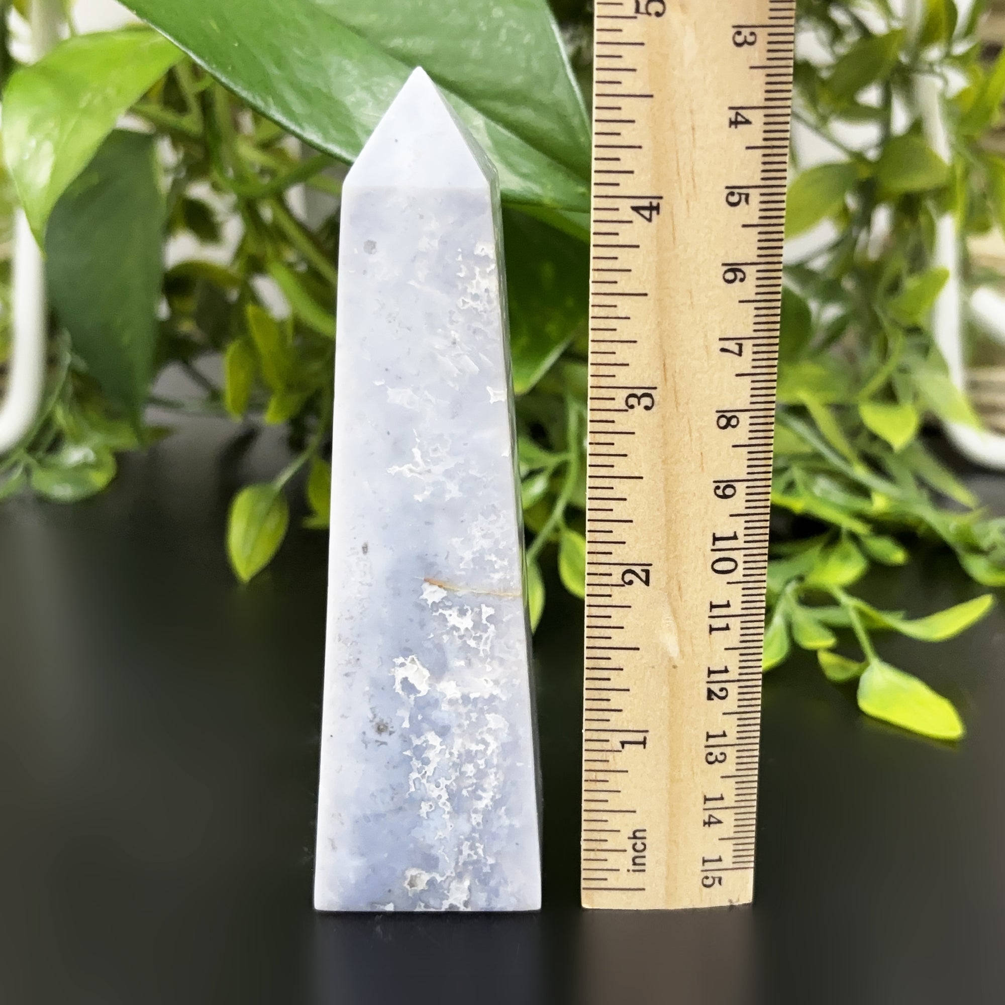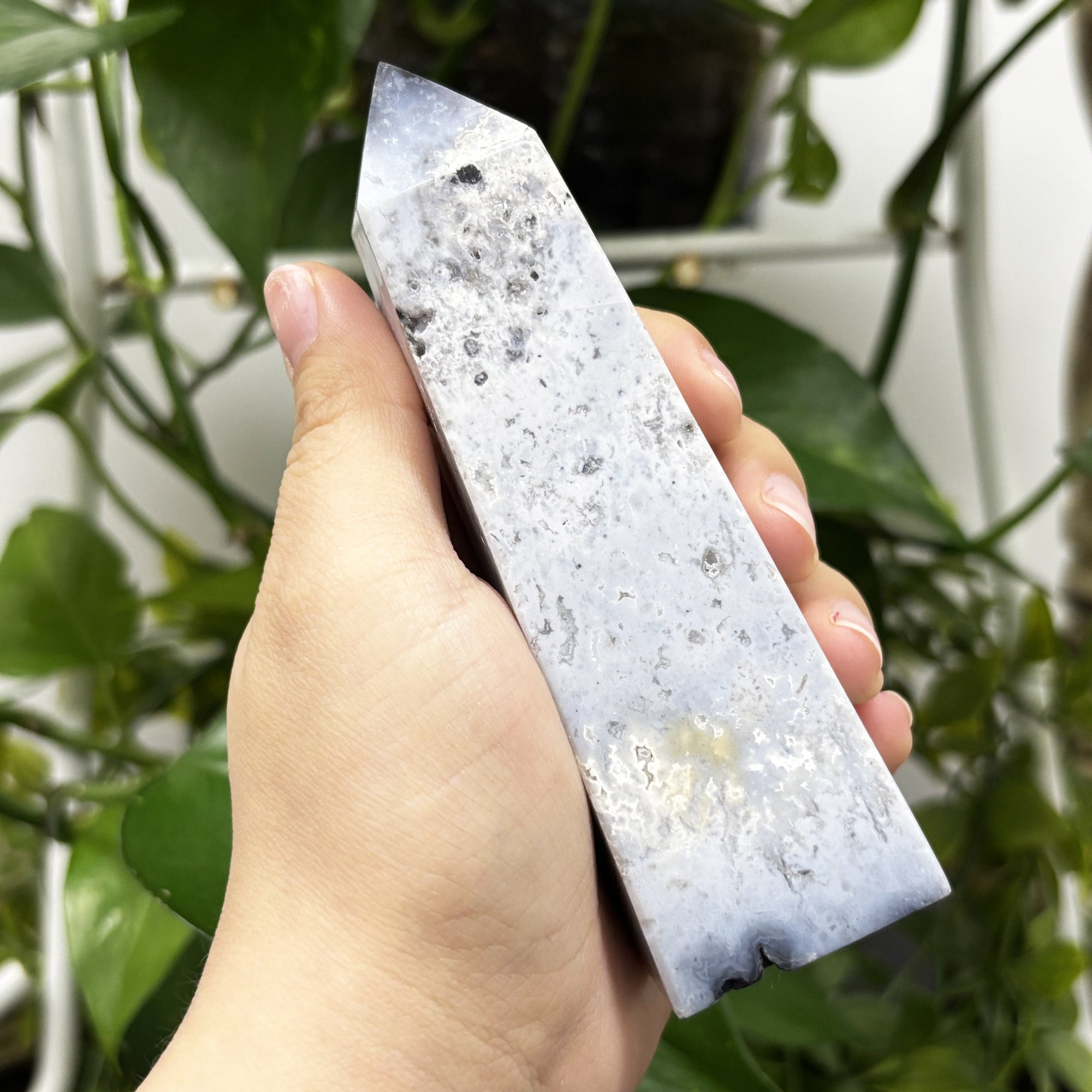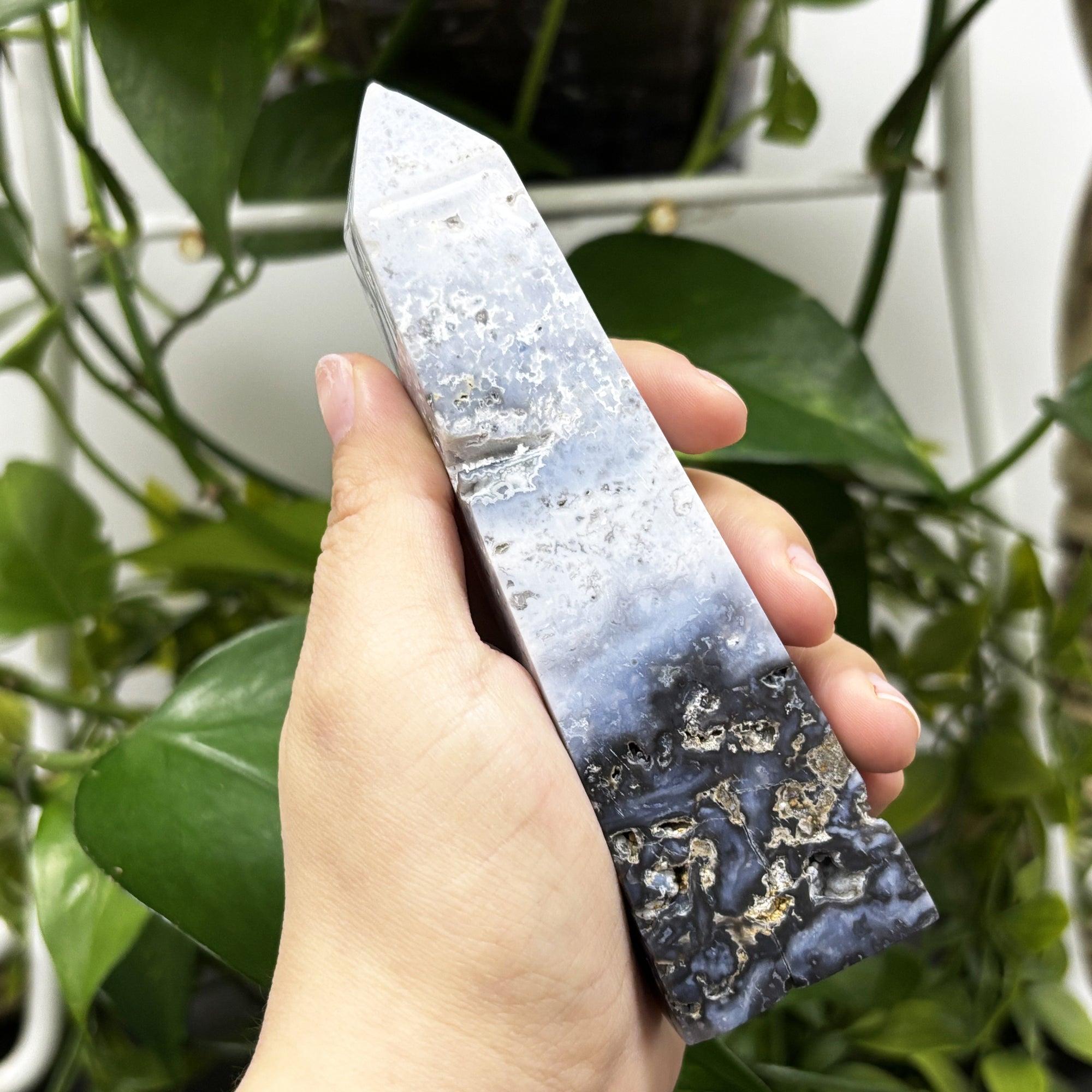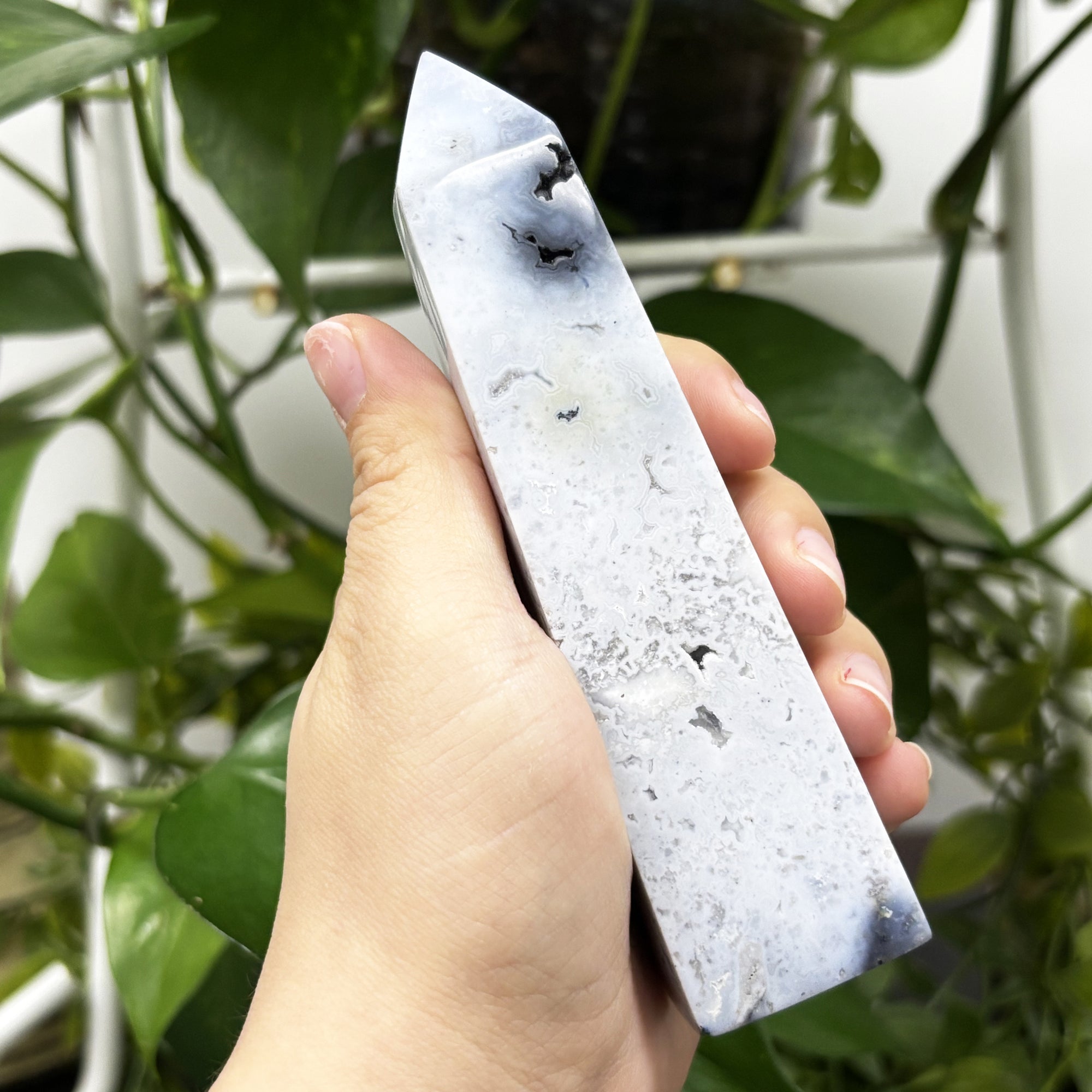Discover the power of this Natural Gray Plume Agate Crystal Obelisk Tower. Its polished surface and pointed shape provide energy, balance, and spiritual growth. This healing stone is perfect for those seeking inner harmony and personal development. Add it to your collection for a natural boost in well-being.