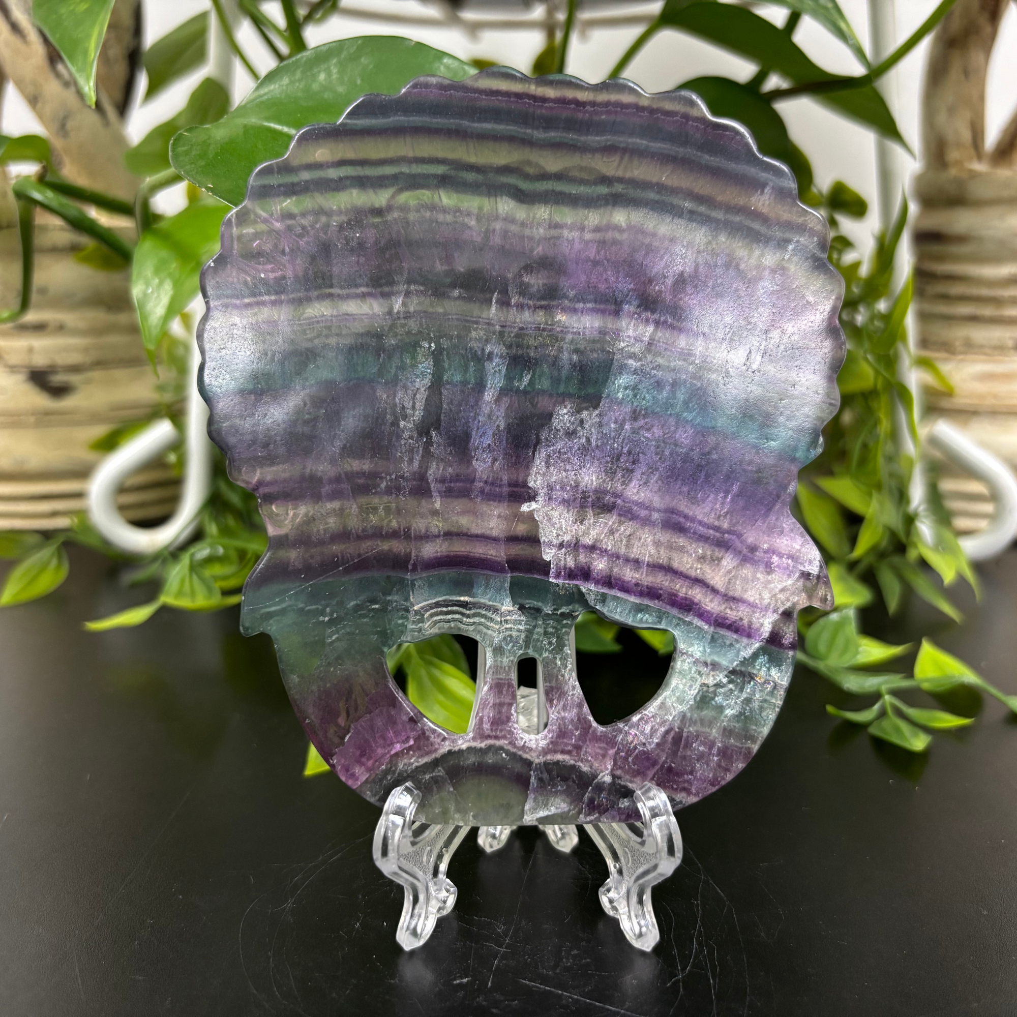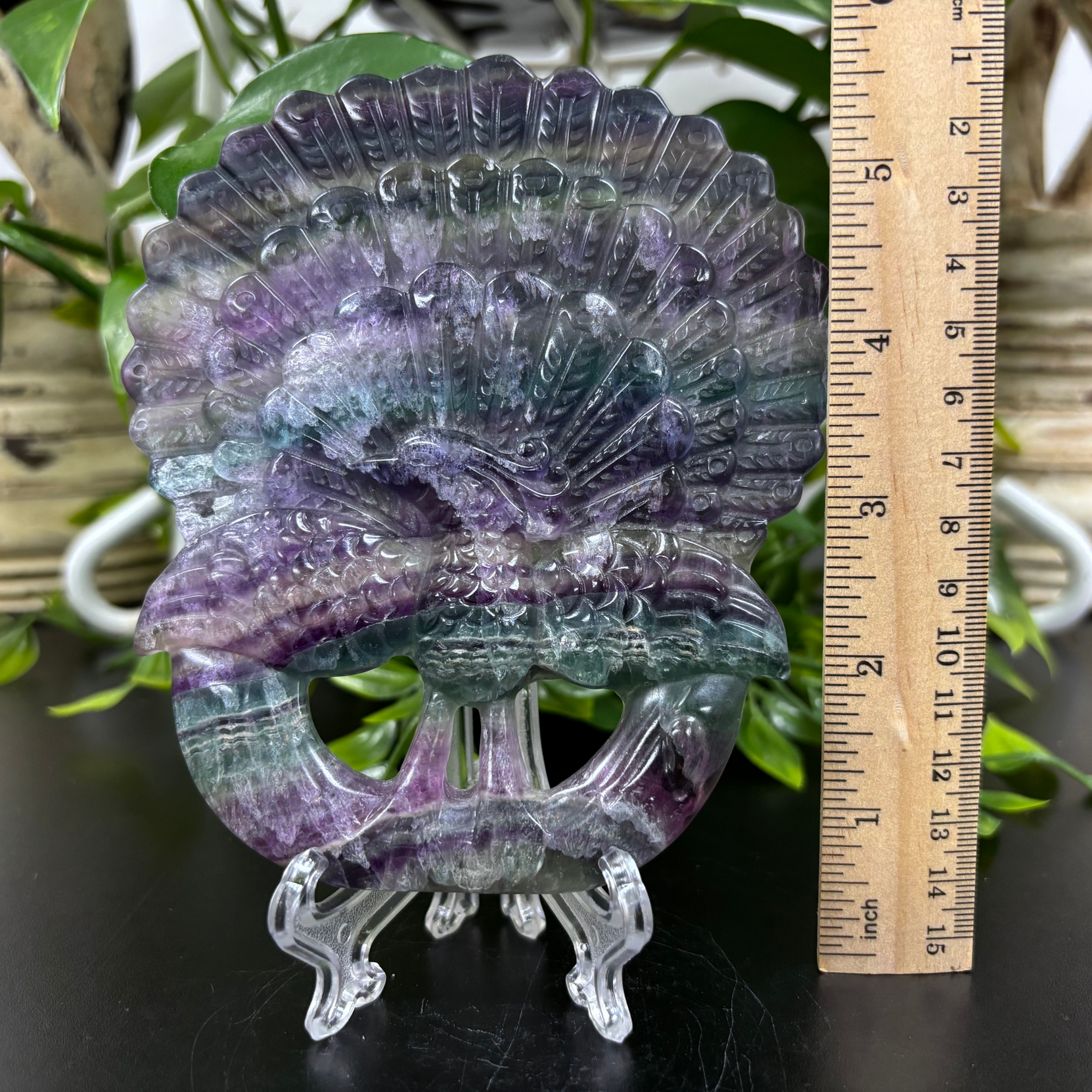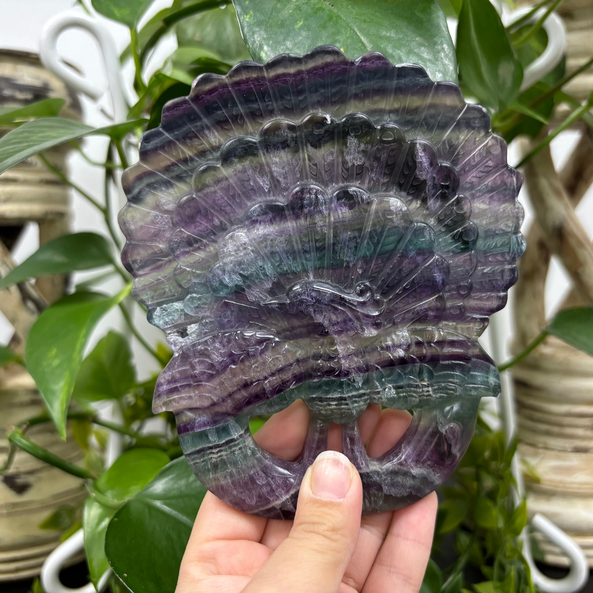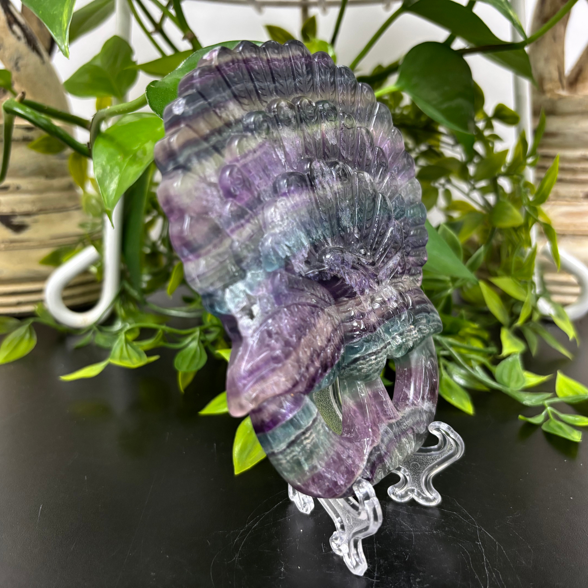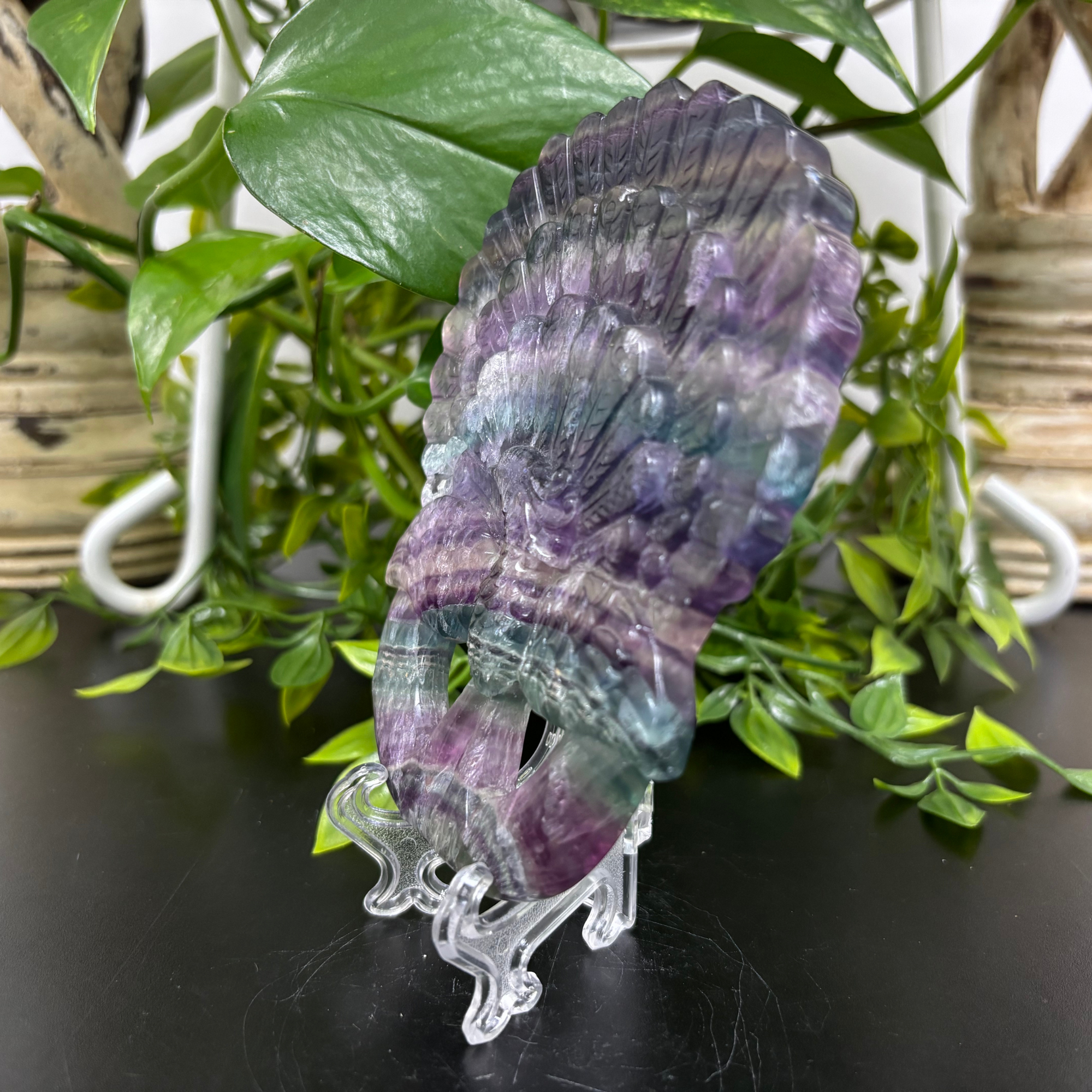 This Fluorite Peacock Carving is a finely detailed sculpture crafted from natural fluorite, showcasing vibrant bands of purples, greens, and blues unique to each piece. The peacock, known for its graceful form and ornate plumage, is expertly represented with intricate hand-carved features, capturing the elegance and beauty of the bird in stone. The natural translucence of fluorite adds depth and visual interest, making this carving a striking decorative accent.