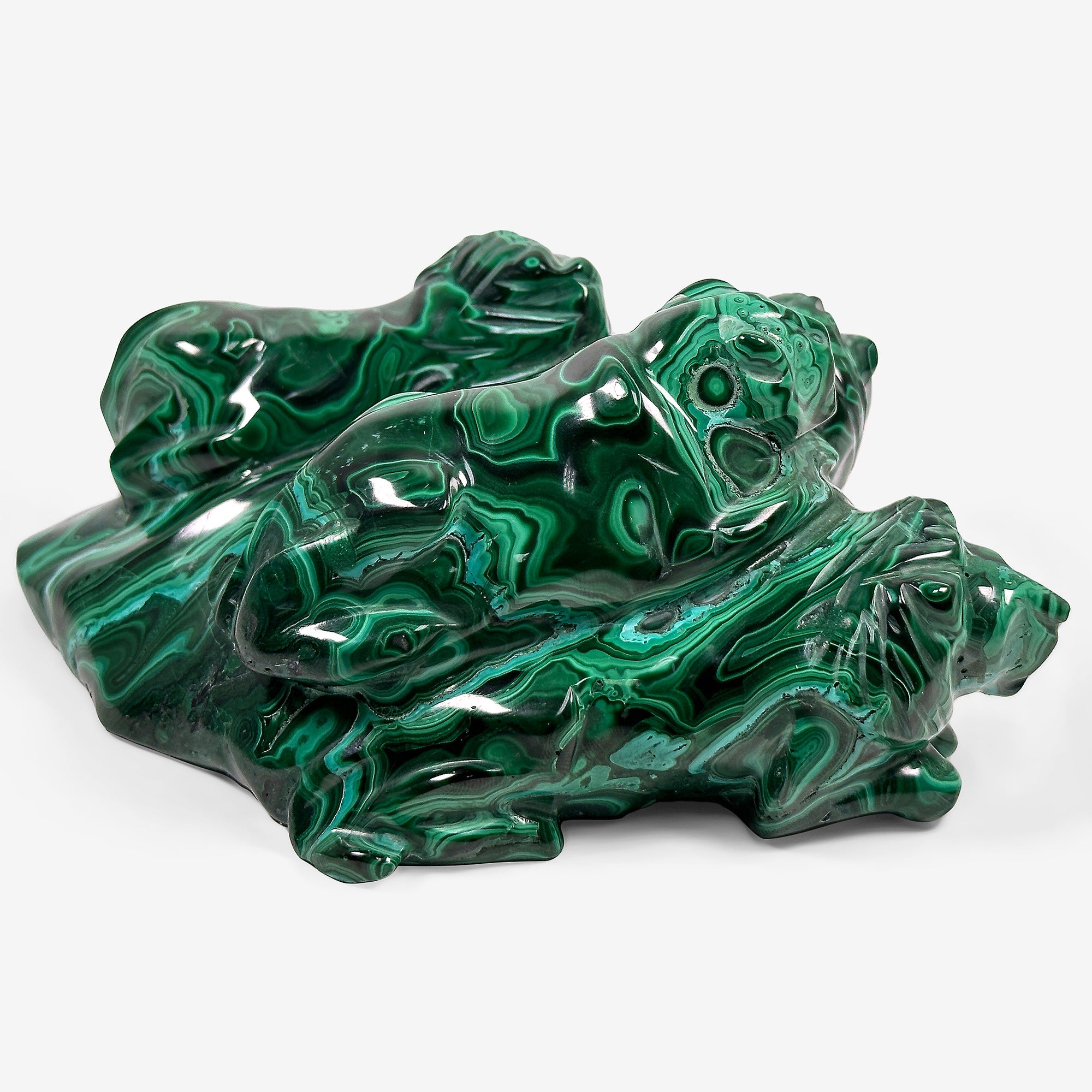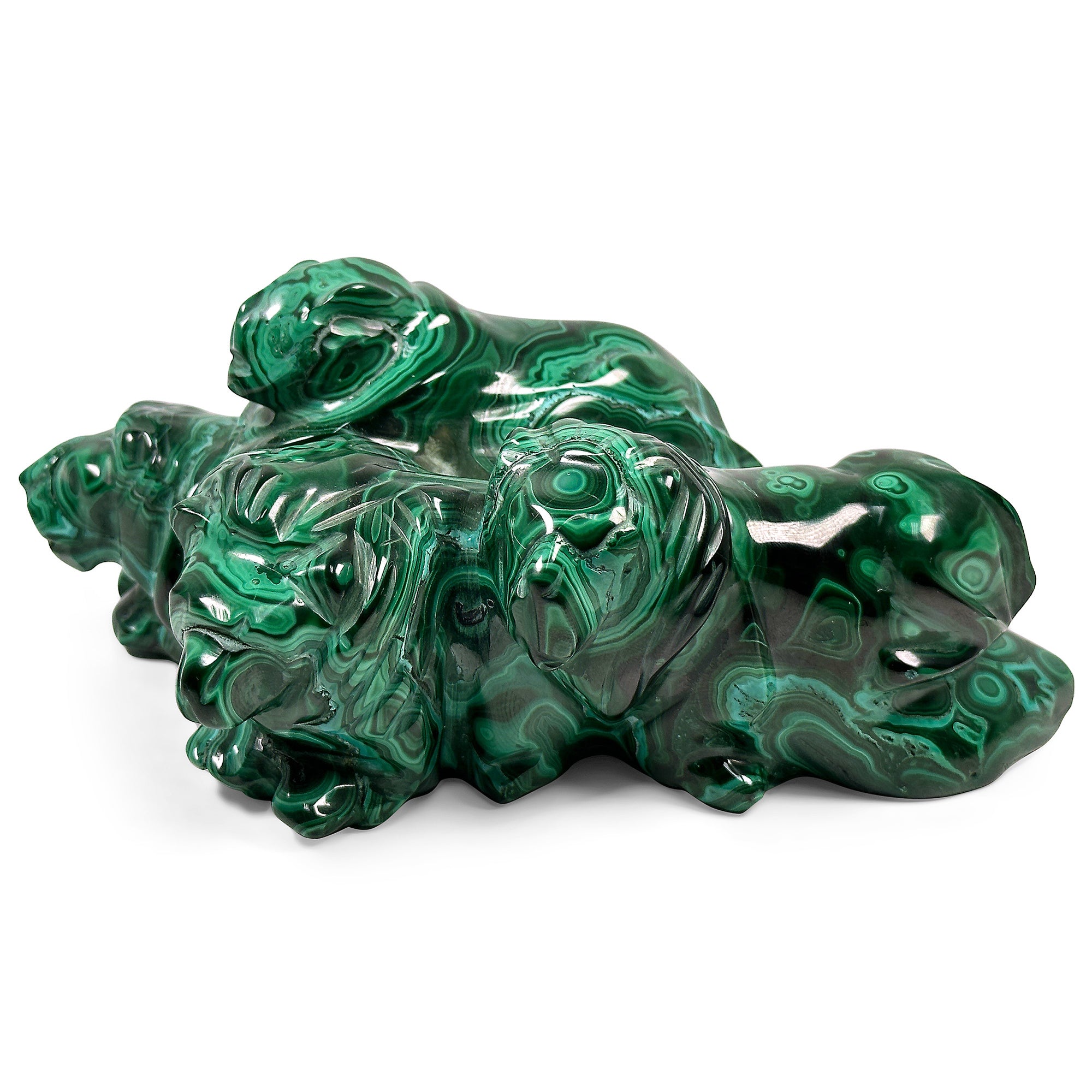 Directly from Congo, fall in love with this unique lion pride Malachite carving! Standing tall and majestic this carving features four strong lions with various vibrant shades of green from dark to light and unique patterns/designs. This lion pride Malachite carving will make the perfect addition to any home or collection! It measures approximately 6 inches in length by 4 inches in width by 2 inches in height and weighs 2.75 Lb.