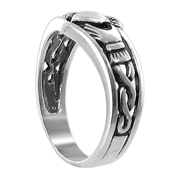 This 925-sterling silver ring continues the tradition of the Irish with the Claddagh design in its classic fashion. This Irish symbol first appeared in the 17th century as a ring and has been a part of Irish and modern Celtic cultural resurgence. The Claddagh's distinctive design features two hands clasping a heart and is usually surmounted by a crown. The elements of this symbol are often said to correspond to the qualities of love (the heart), friendship (the hands), and loyalty (the crown).