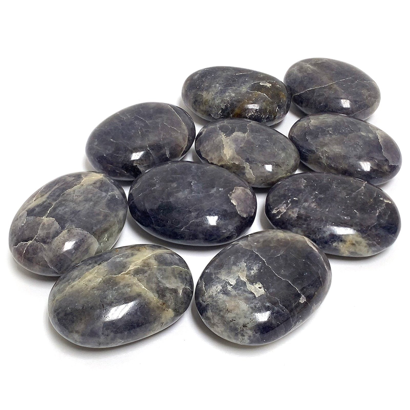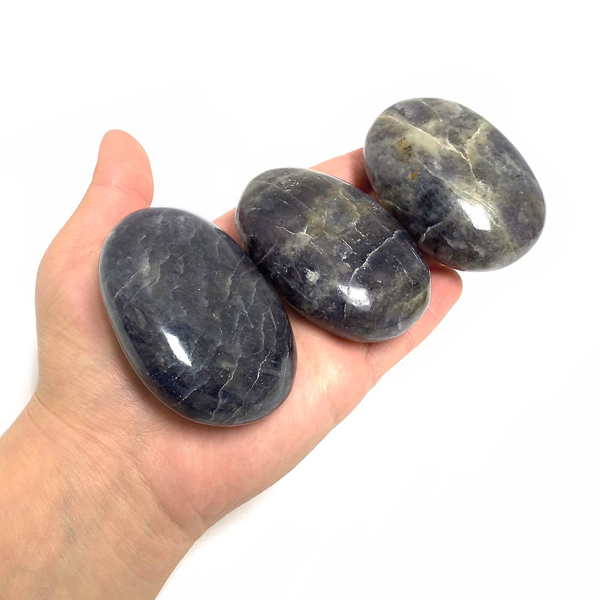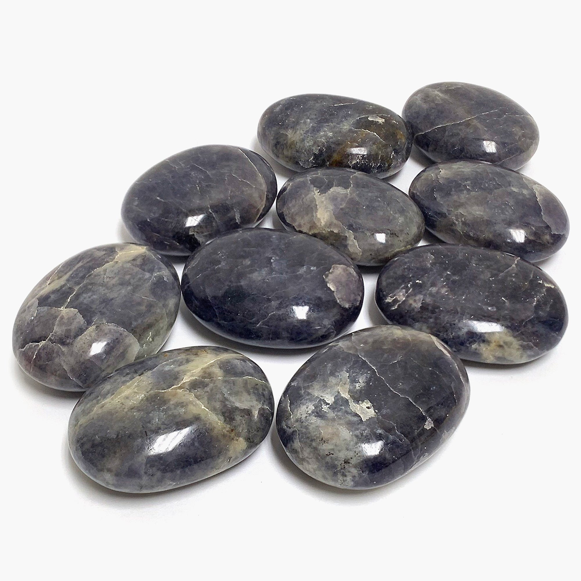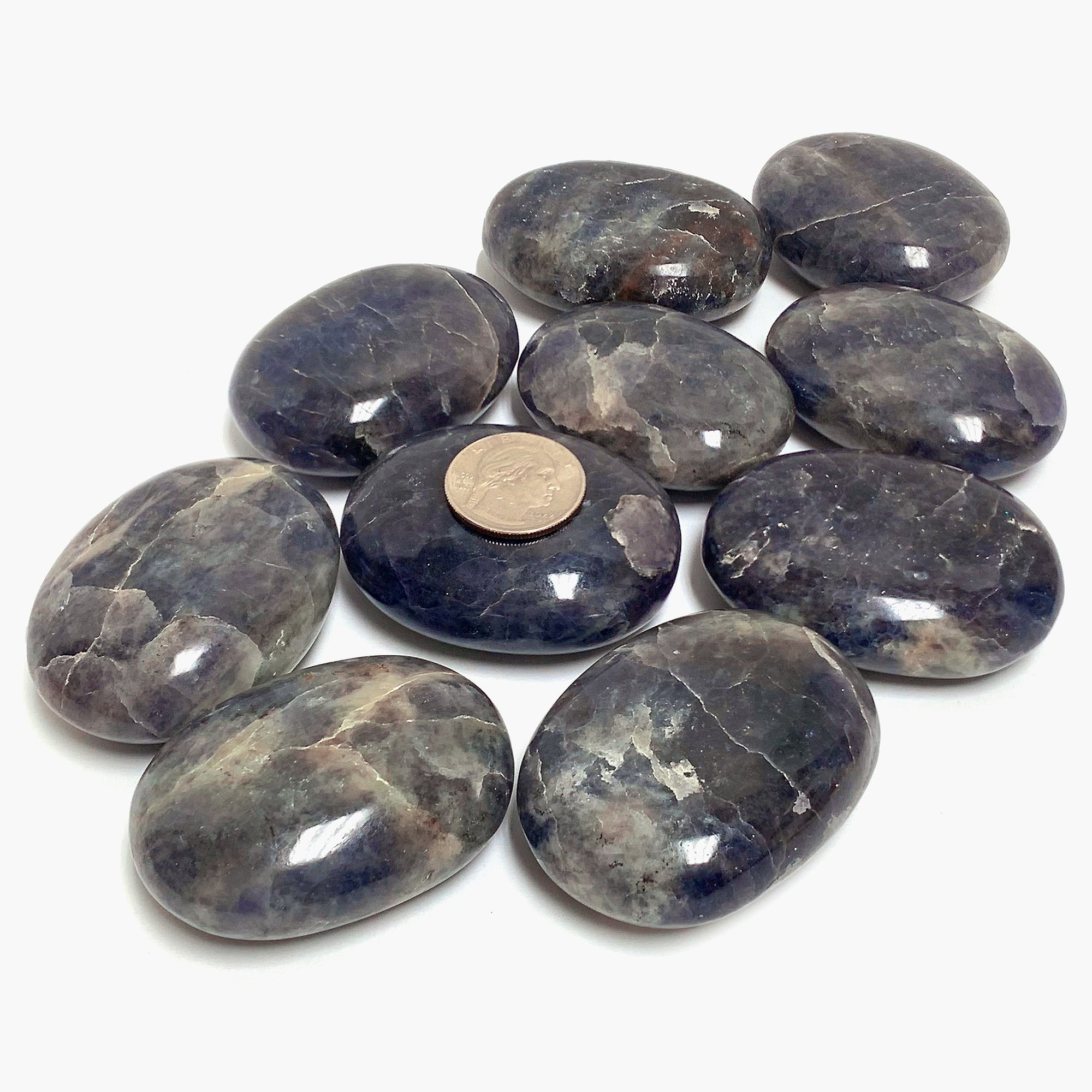Beautifully unique, fall in love with these stunning Iolite palm stones! Found on these palm stones are deep rich shades of violet and blue accompanied by touches of white and gray. Please note you will receive One Iolite palm stone chosen at random, please allow for some variance between stones such as size, shape, and color. It measures approximately 2 inches in length by 0.5 to 0.75 inches in width and weighs 2.8oz to 3.8oz.