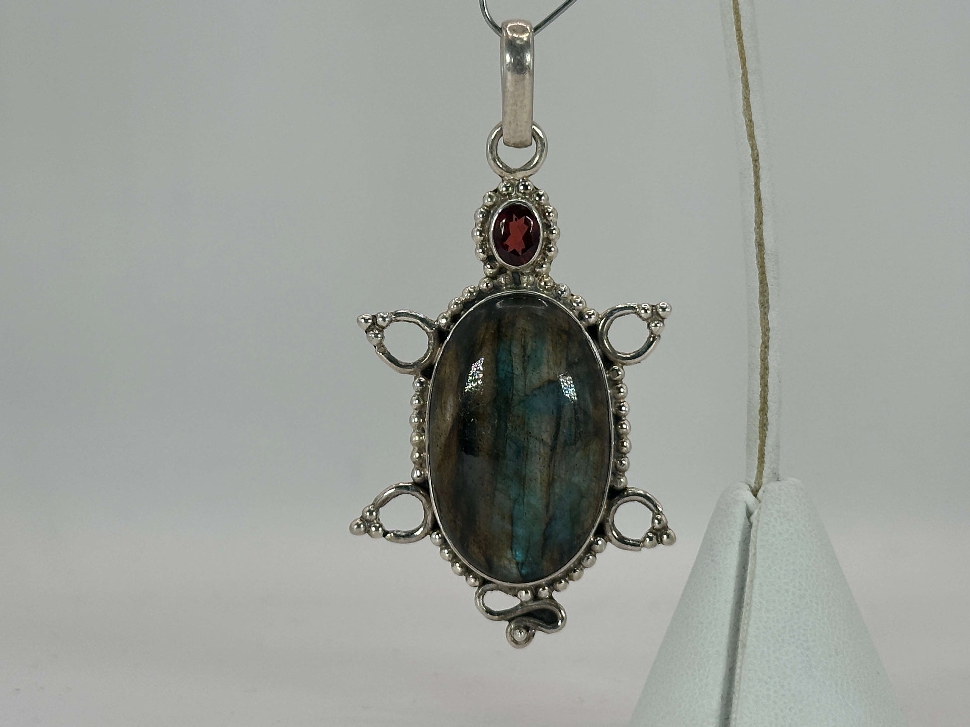 Crafted from solid 925 sterling silver, this artisan turtle pendant showcases a vibrant labradorite stone paired with a deep red garnet. The piece weighs 17.91 gram, offering a substantial yet comfortable feel.