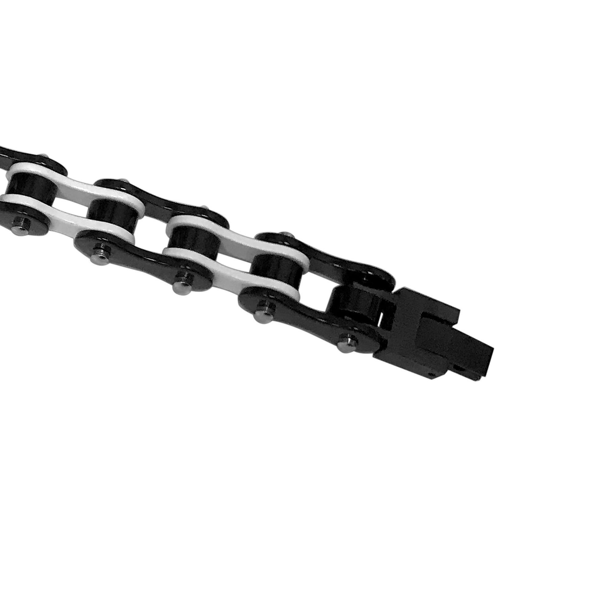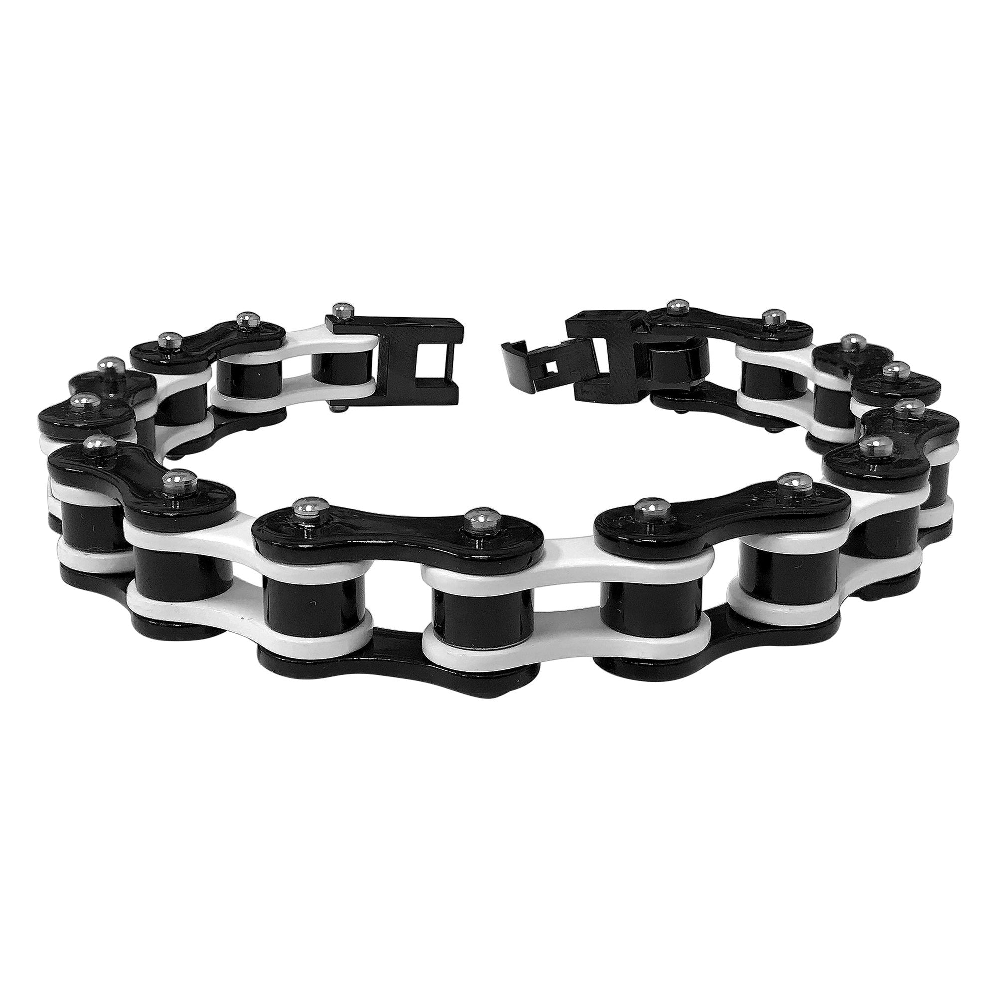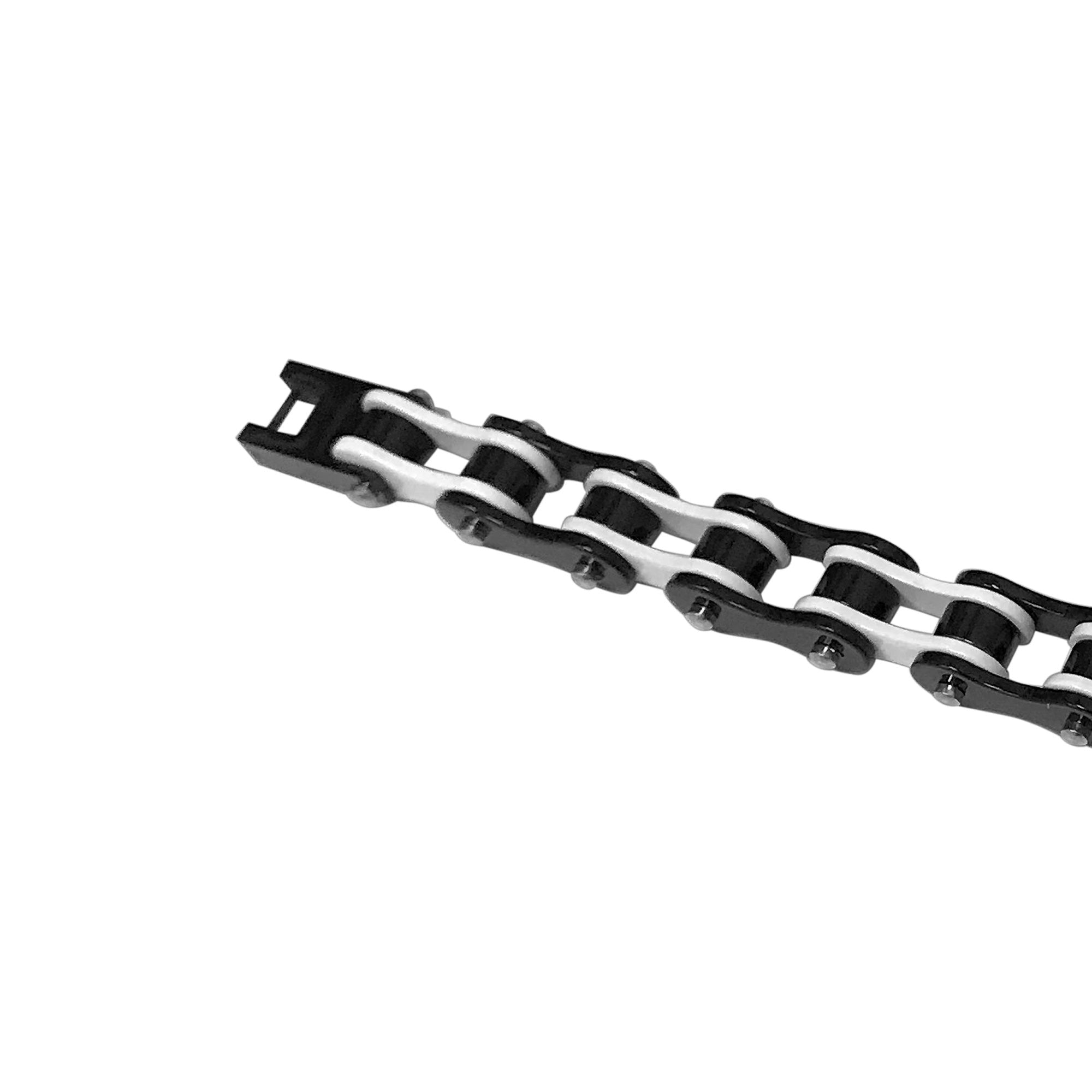 Men's Stainless Steel Two-Tone Black and White 10mm Wide Bike Link Chain 8.5" Bracelet. Make a style statement with this stand-out bracelet. Sport a sharp, modern style with its unique two-tone design that complements any look. Enjoy a long-lasting piece that won't tarnish or lose its shine. Built to withstand everyday wear with its robust construction, it's an essential accessory for any modern man.