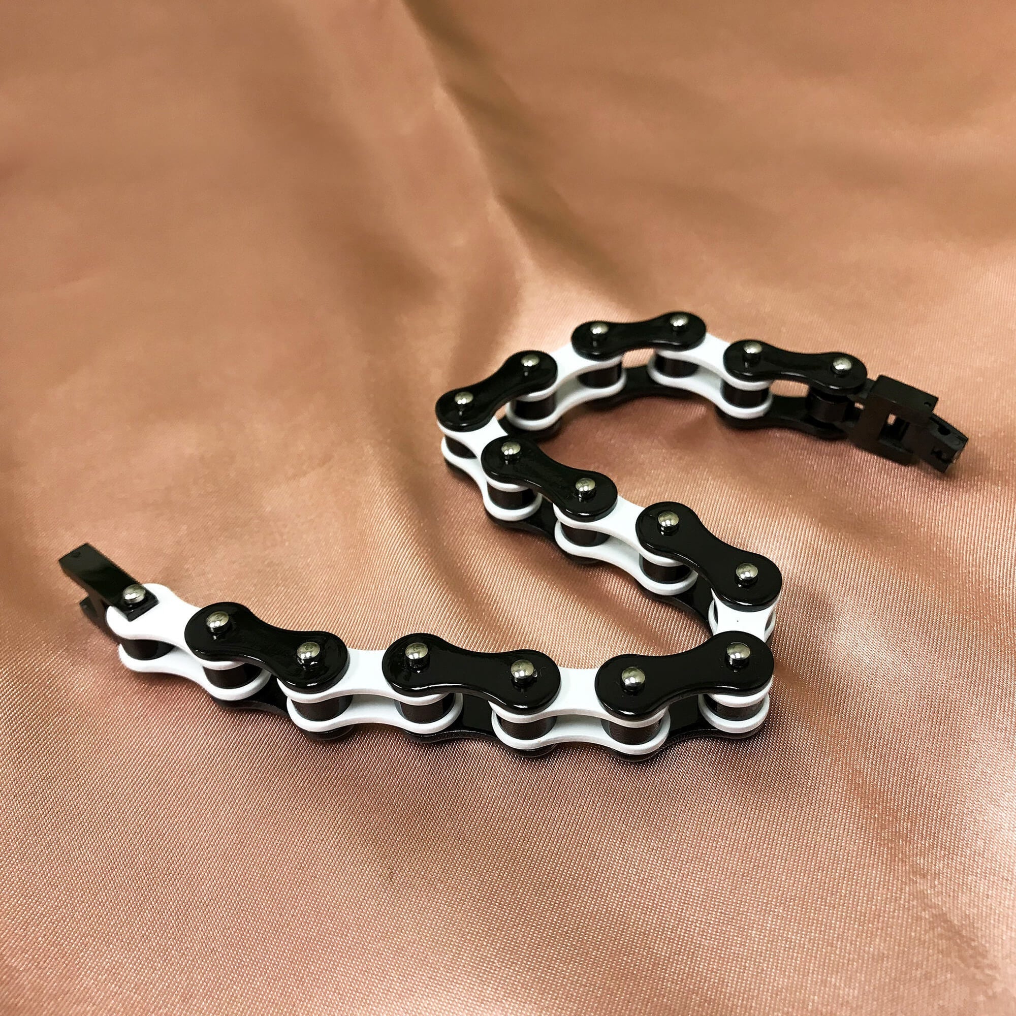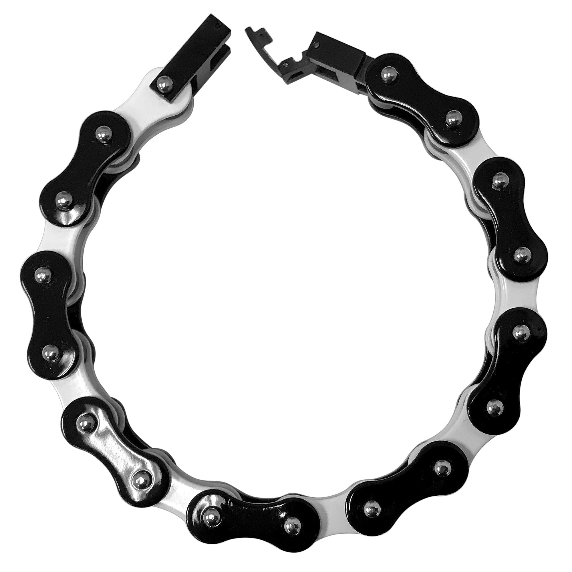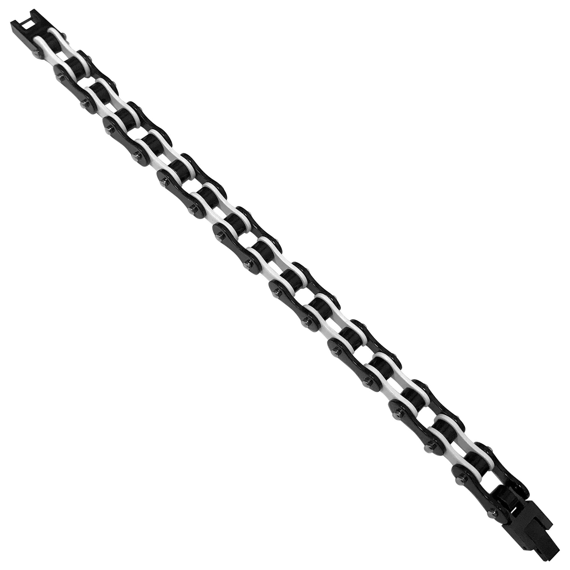 Men's Stainless Steel Two-Tone Black and White 10mm Wide Bike Link Chain 8.5" Bracelet. Make a style statement with this stand-out bracelet. Sport a sharp, modern style with its unique two-tone design that complements any look. Enjoy a long-lasting piece that won't tarnish or lose its shine. Built to withstand everyday wear with its robust construction, it's an essential accessory for any modern man.