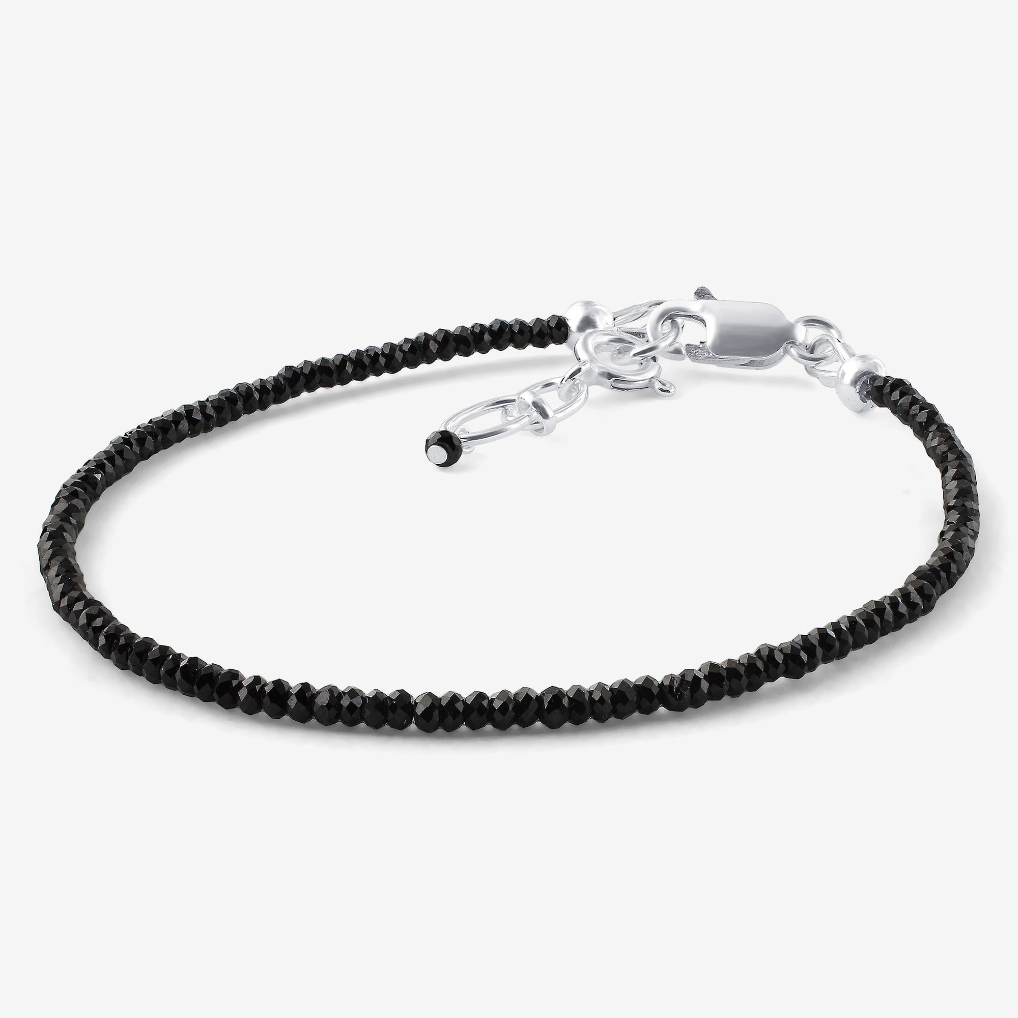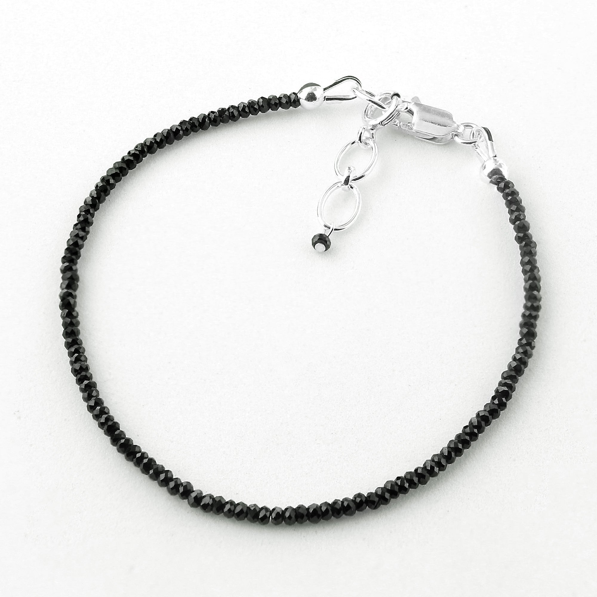 Beautifully crafted in India, add a perfect pop of color and sparkle to any outfit with this gorgeous sterling silver faceted rondelles natural Black Spinel bracelet! This stunning bracelet contains a rich shade of black along with a secure lobster clasp. The perfect accessory to any outfit, this sterling silver faceted rondelles natural Black Spinel bracelet is a sure must have! It measures approximately 7.5 inches in length by 1.5mm in Bead Size and weighs: 3 grams