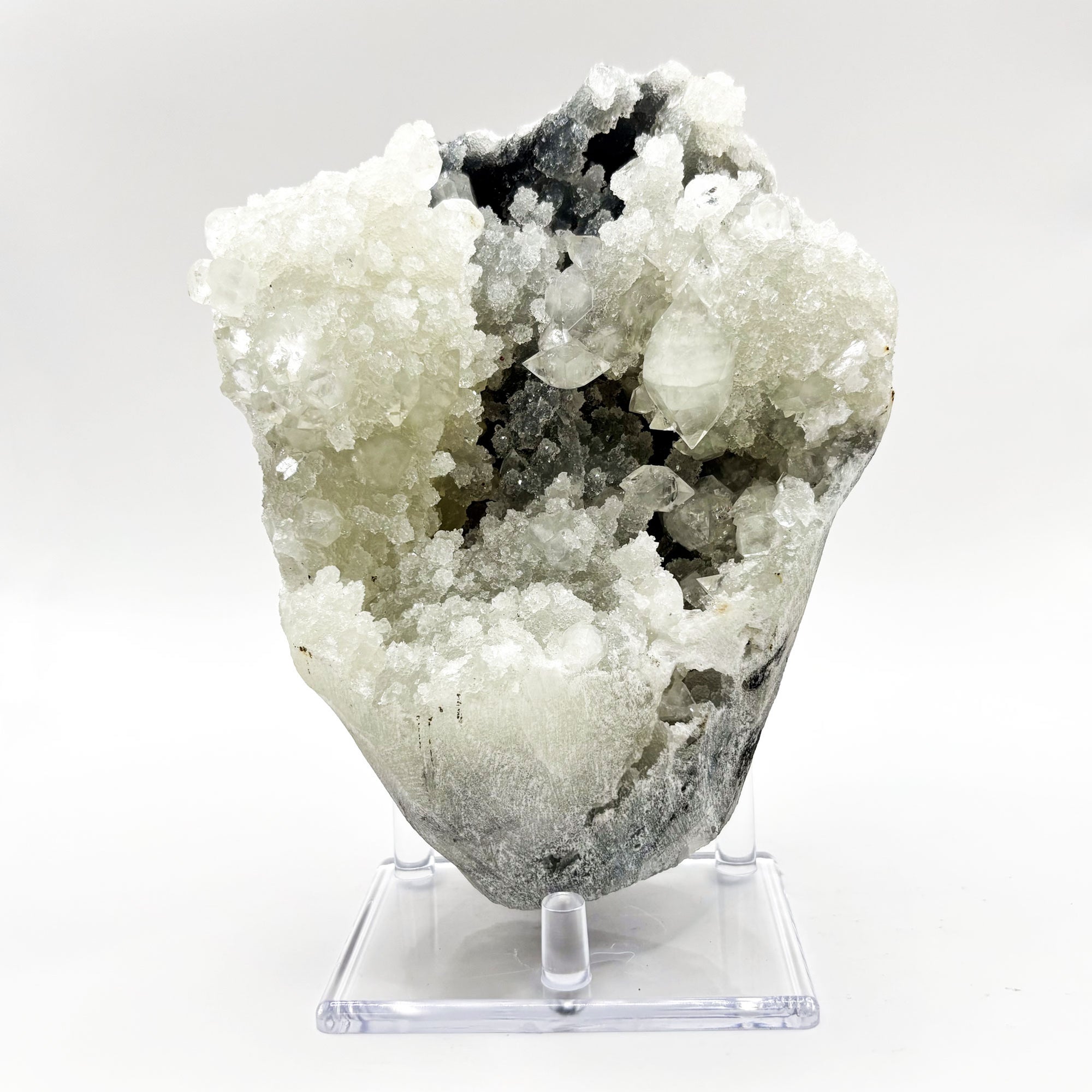 Experience the calming energy of this crystal cluster, which is perfect for meditation, energy work, or simply as a decorative piece. The combination of Chalcedony's soothing properties and Apophyllite's high vibration makes this specimen an excellent tool for enhancing mental clarity, promoting spiritual growth, and fostering a sense of peace and tranquility.