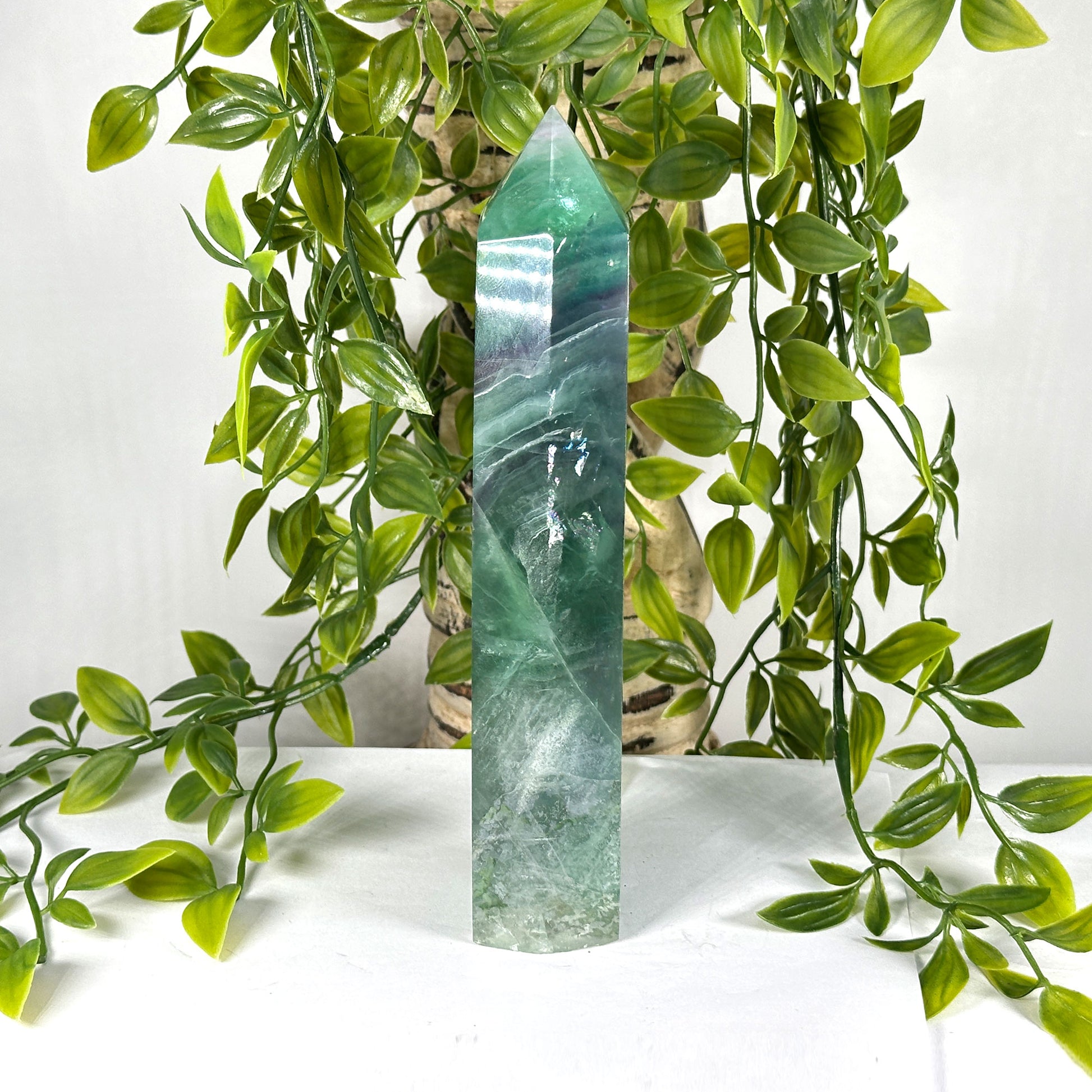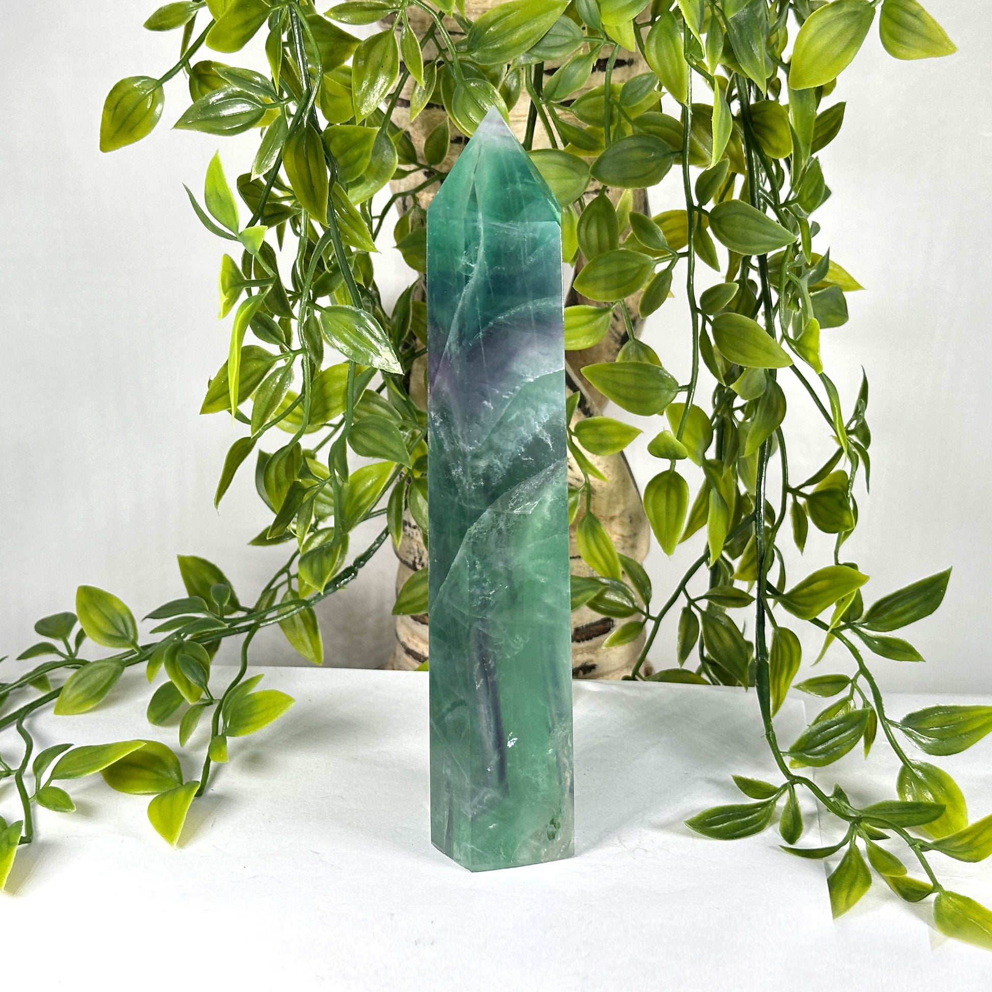 - description_tag : Discover the calming energy of a green and purple banded fluorite tower, perfect for meditation and home decor. Shop now at Gem Avenue in Charlotte.