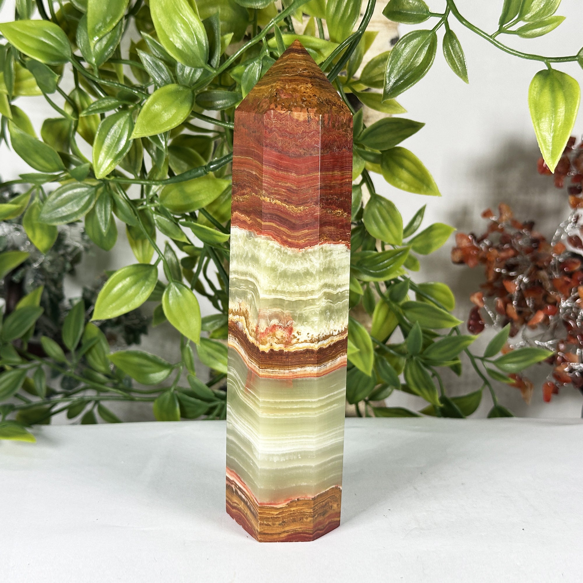 This polished natural green onyx crystal obelisk tower is crafted from genuine onyx stone. It features a sleek polished finish and weighs 15.2 oz, providing a solid presence for display.