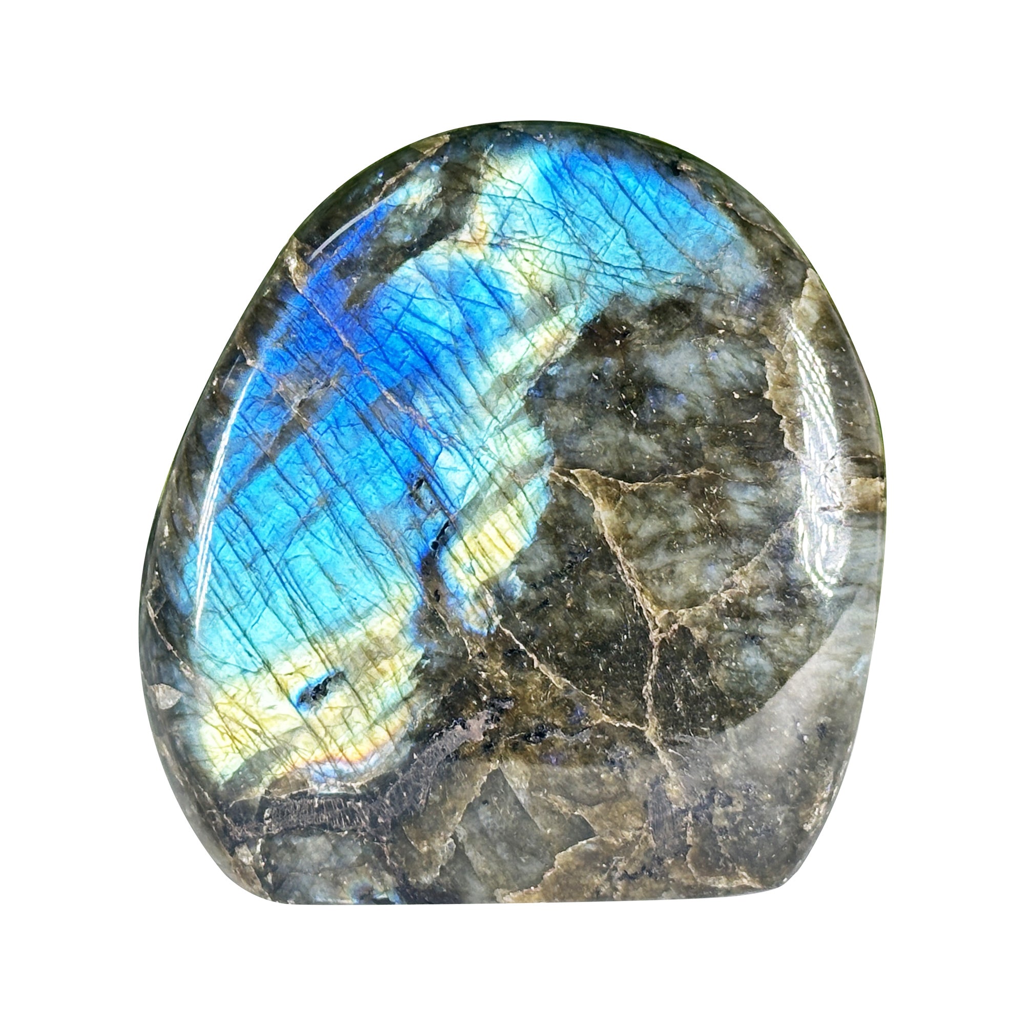 Natural Madagascar labradorite stone is hand polished to a smooth freeform shape. The surface displays a bright blue flash that catches the light, highlighting the stone's natural iridescence and solid mineral composition.