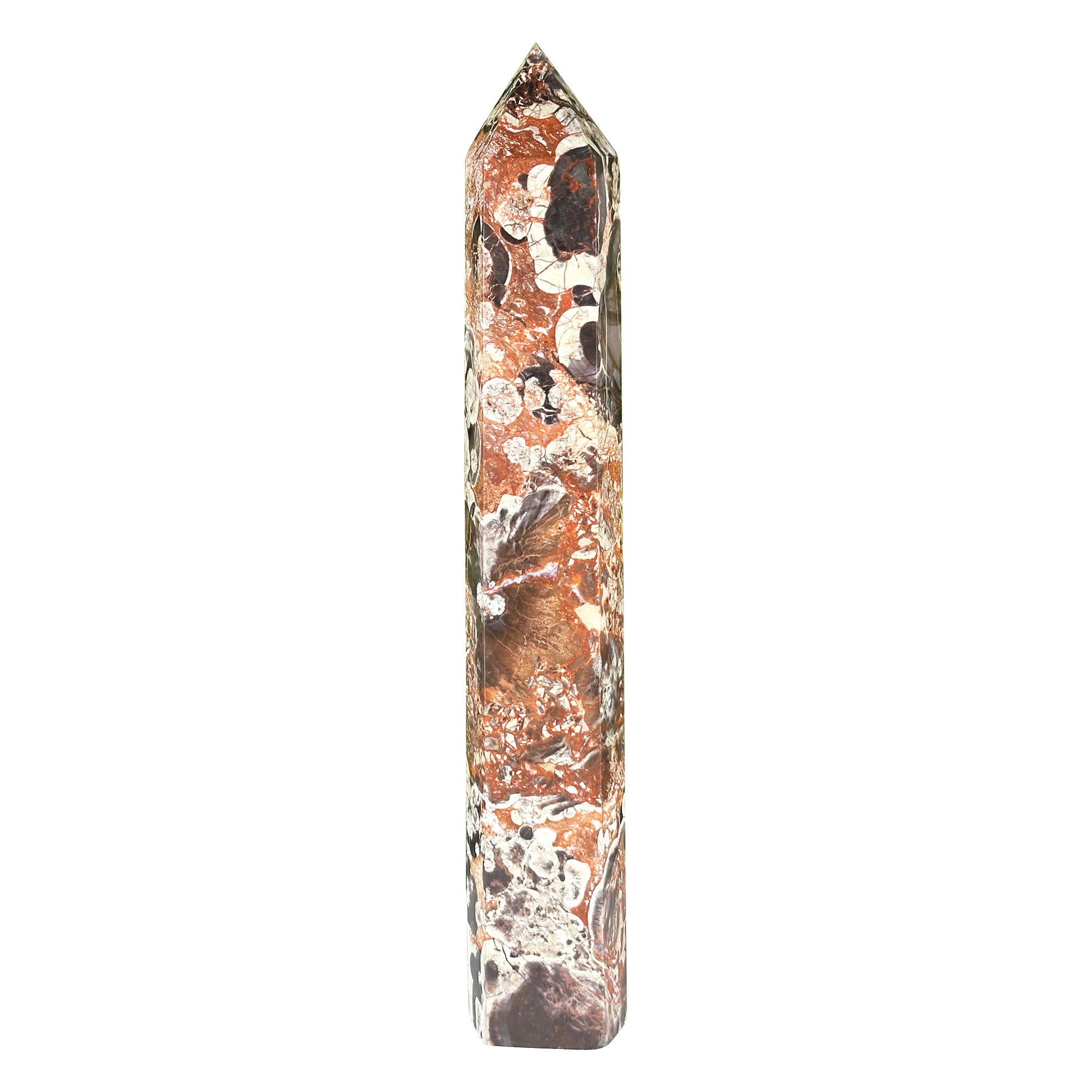 Natural money agate crystal is expertly polished into a sleek obelisk tower. The stone is solid and weighs 1.06 lb, offering a substantial presence without the need for additional hardware.