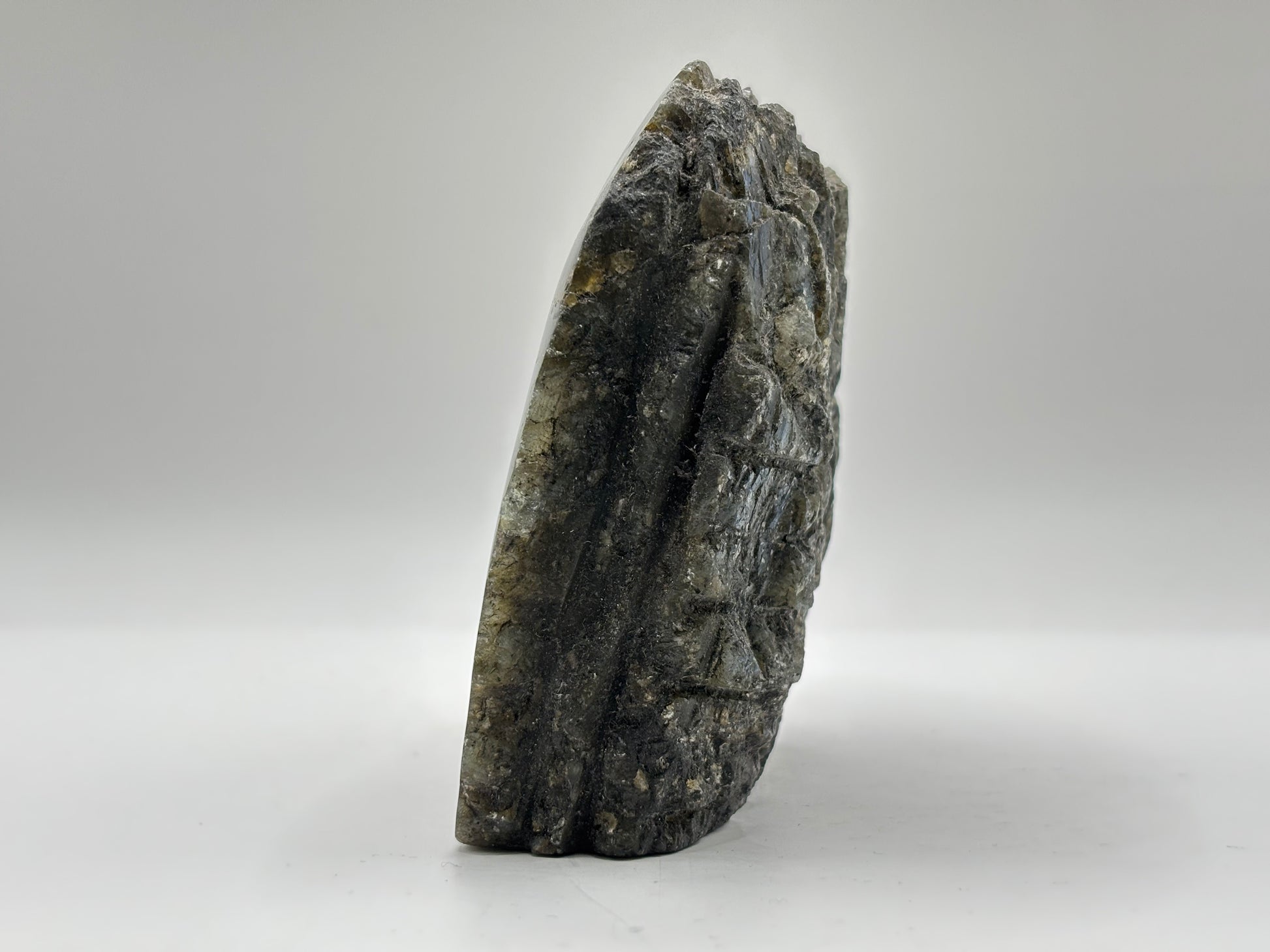 Experience the captivating beauty of this Natural Polished Labradorite Freeform Crystal, sourced from the vibrant landscapes of Madagascar. This stunning specimen measures approximately 3.5 inches in length, 1.5 inches in width, and 4 inches in height, weighing around 1.43 pounds. Its unique, freeform shape showcases a mesmerizing display of blue and gold flashes, created by the play of light on its labradorescent surface. The crystal is expertly polished, revealing its natural, earthy charm, and is ready to enhance any space with its raw, organic appeal.