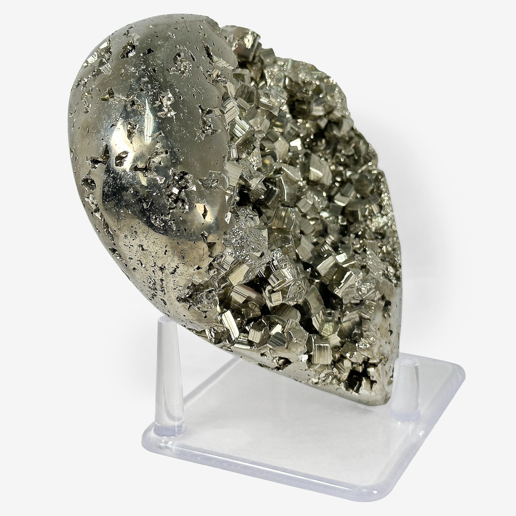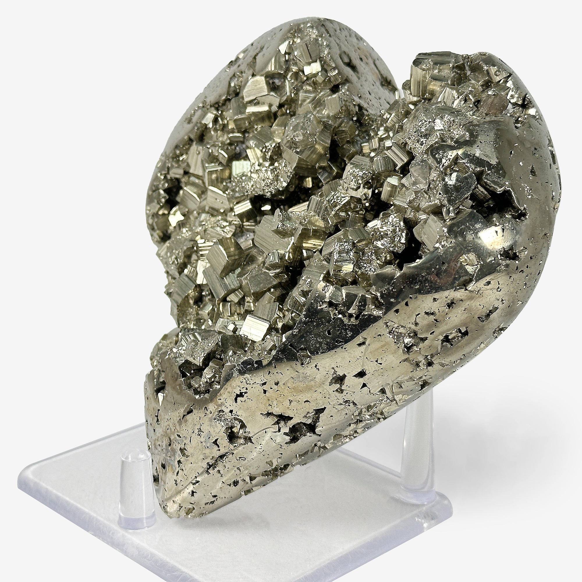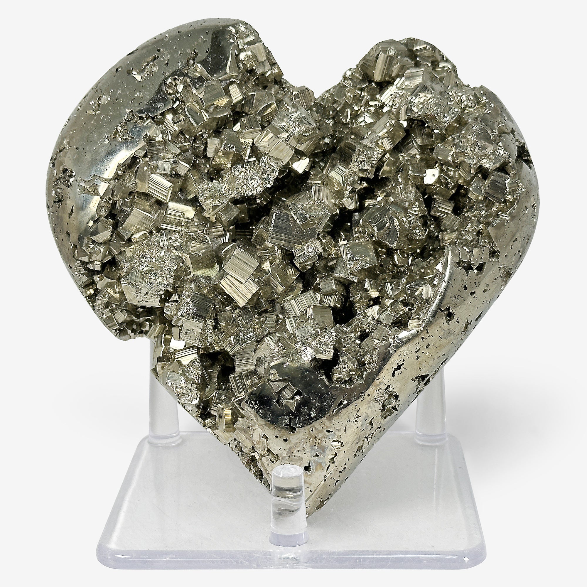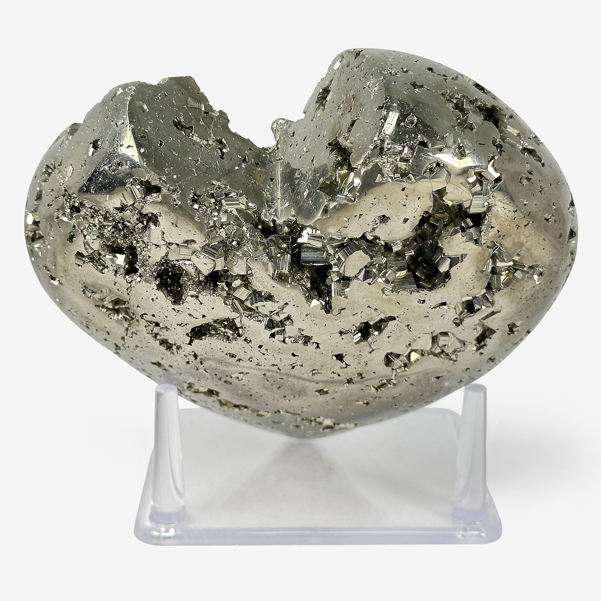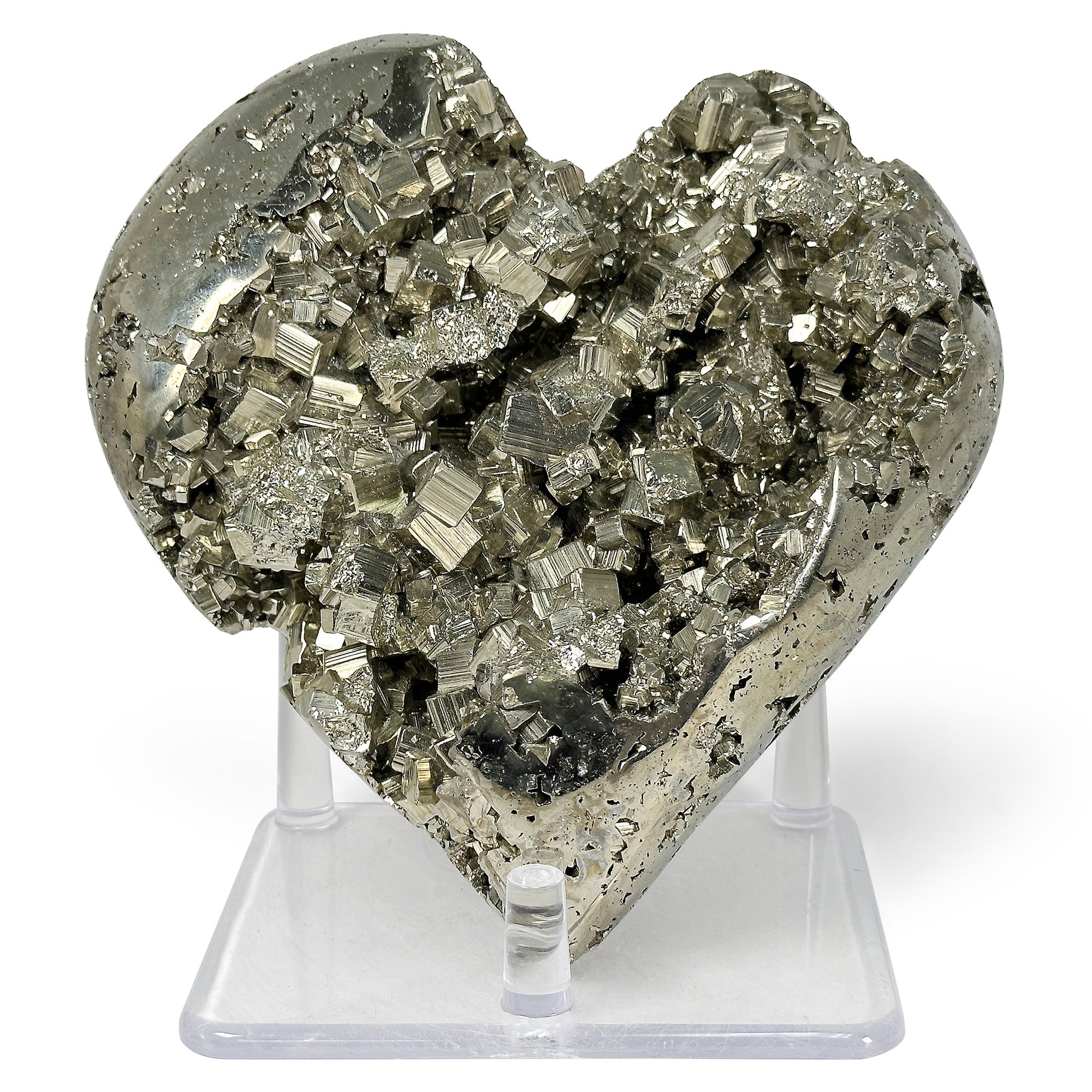 Fall in love with this beautiful heart shaped Pyrite! This eye-catching piece comes to us all the way from Peru and contains a gorgeous metallic luster along with a stunning brassy yellow shade. Pyrite, also known as fool's gold, is highly beloved for its unique crystal formations which add to the character and beauty of this remarkable piece. This heart shaped Pyrite will make the perfect addition to any home or collection! It measures approximately 5 inches in length by 2 inches in width and weighs 5.2 Lb.