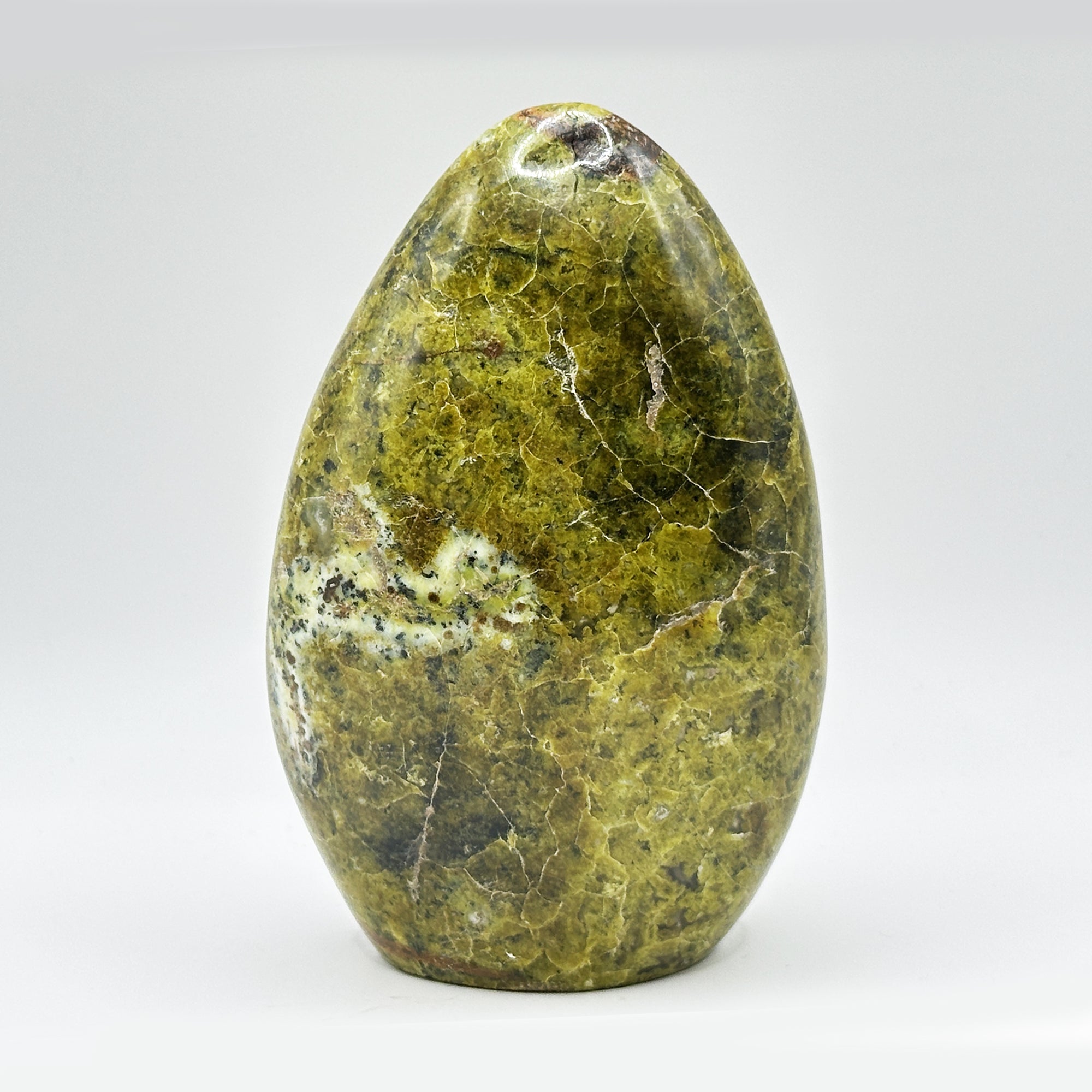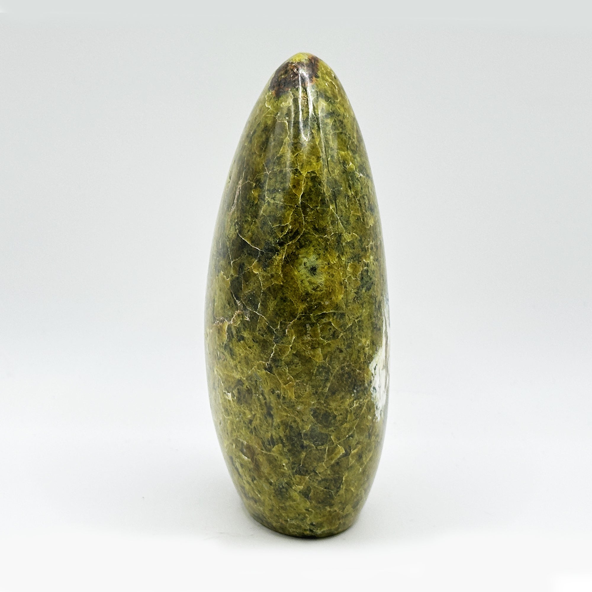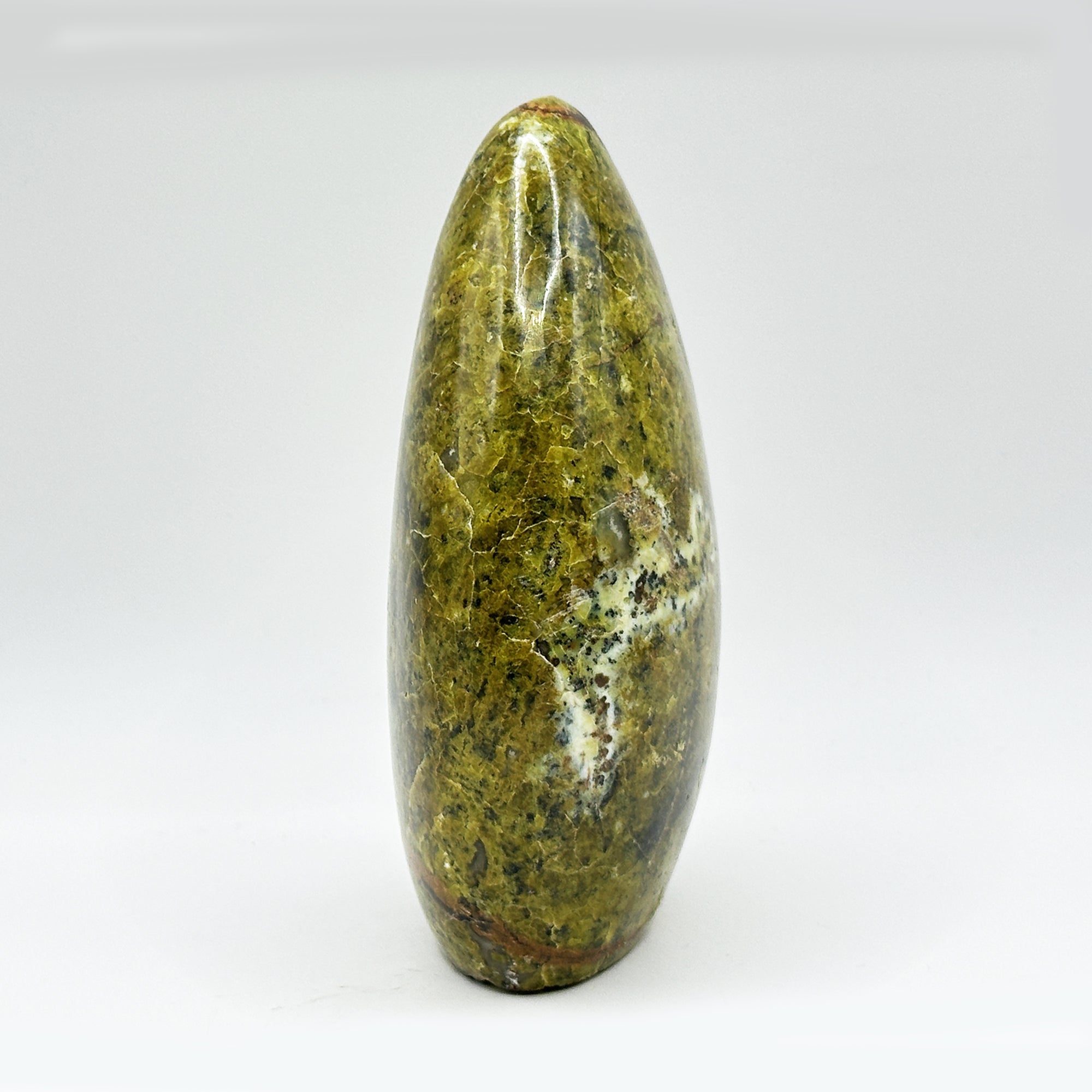Discover the natural beauty of this 4.75 inch polished Green Opal freeform, originating from Madagascar. The seamless, self-standing design allows for effortless display on any surface. This captivating stone's vibrant green hues create a striking visual impact, perfect for adding a touch of earthy elegance to your space. Its smooth finish invites gentle touch and admiration.