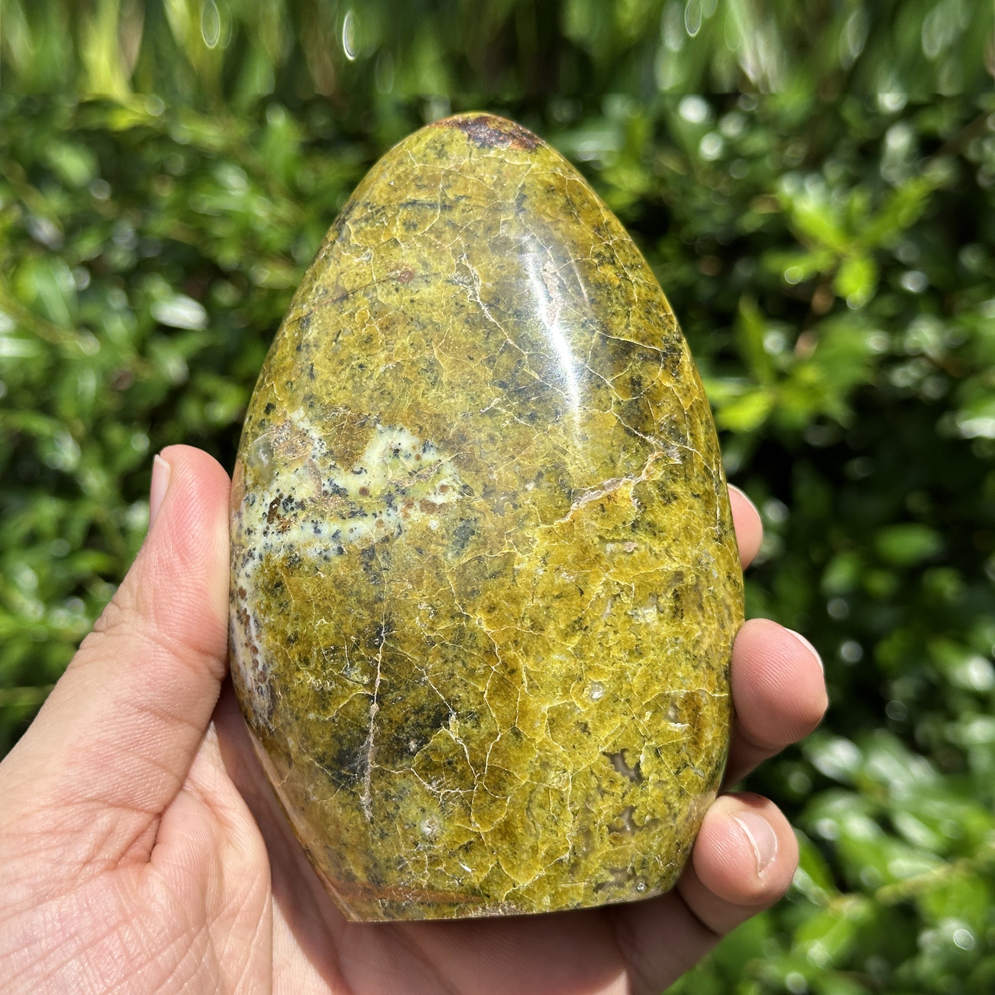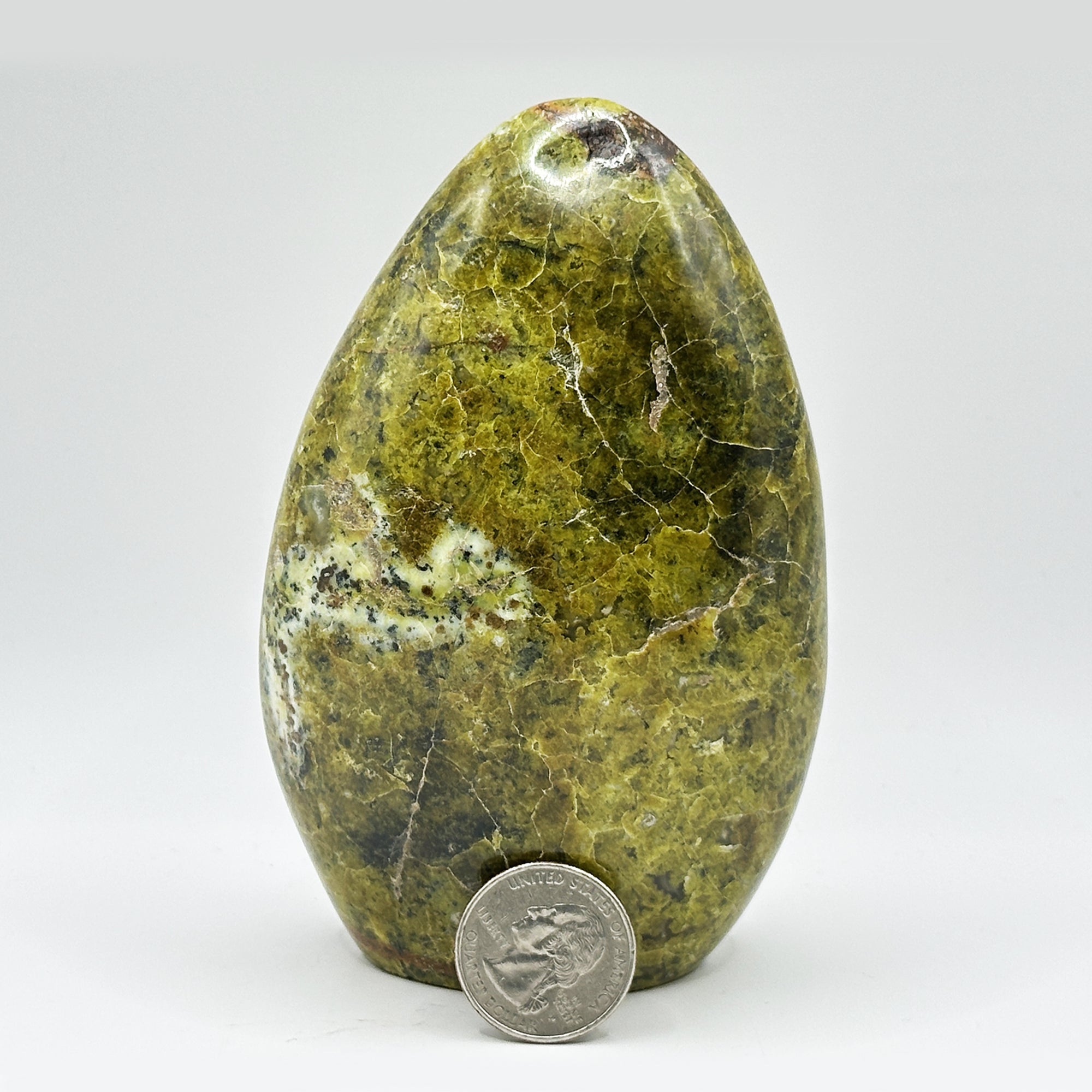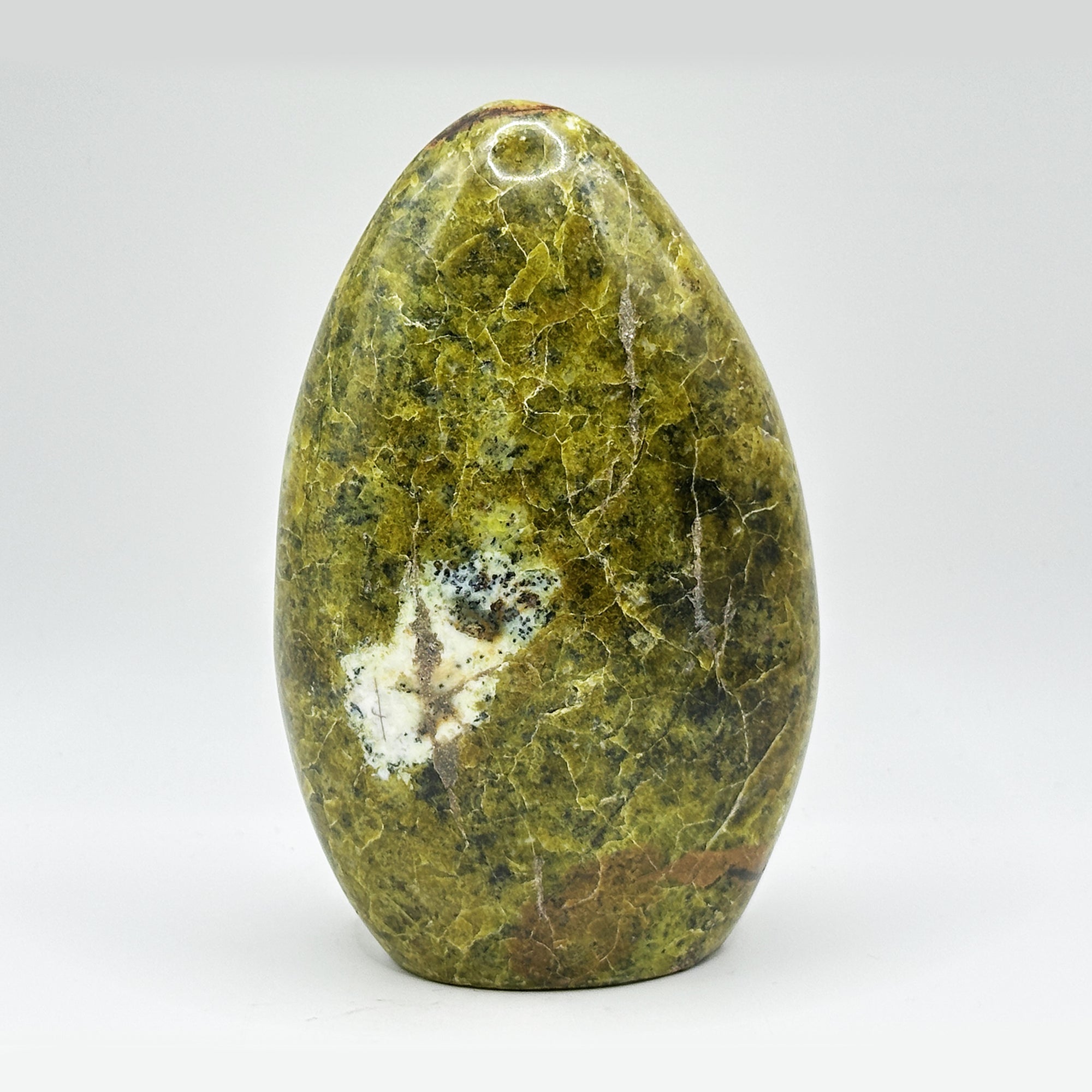 Discover the natural beauty of this 4.75 inch polished Green Opal freeform, originating from Madagascar. The seamless, self-standing design allows for effortless display on any surface. This captivating stone's vibrant green hues create a striking visual impact, perfect for adding a touch of earthy elegance to your space. Its smooth finish invites gentle touch and admiration.