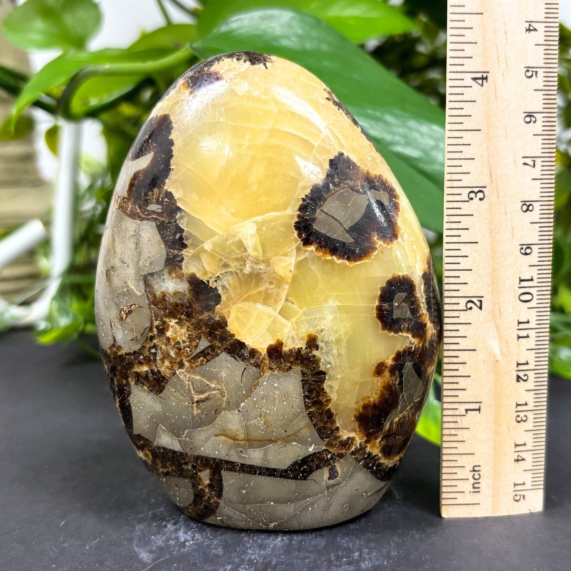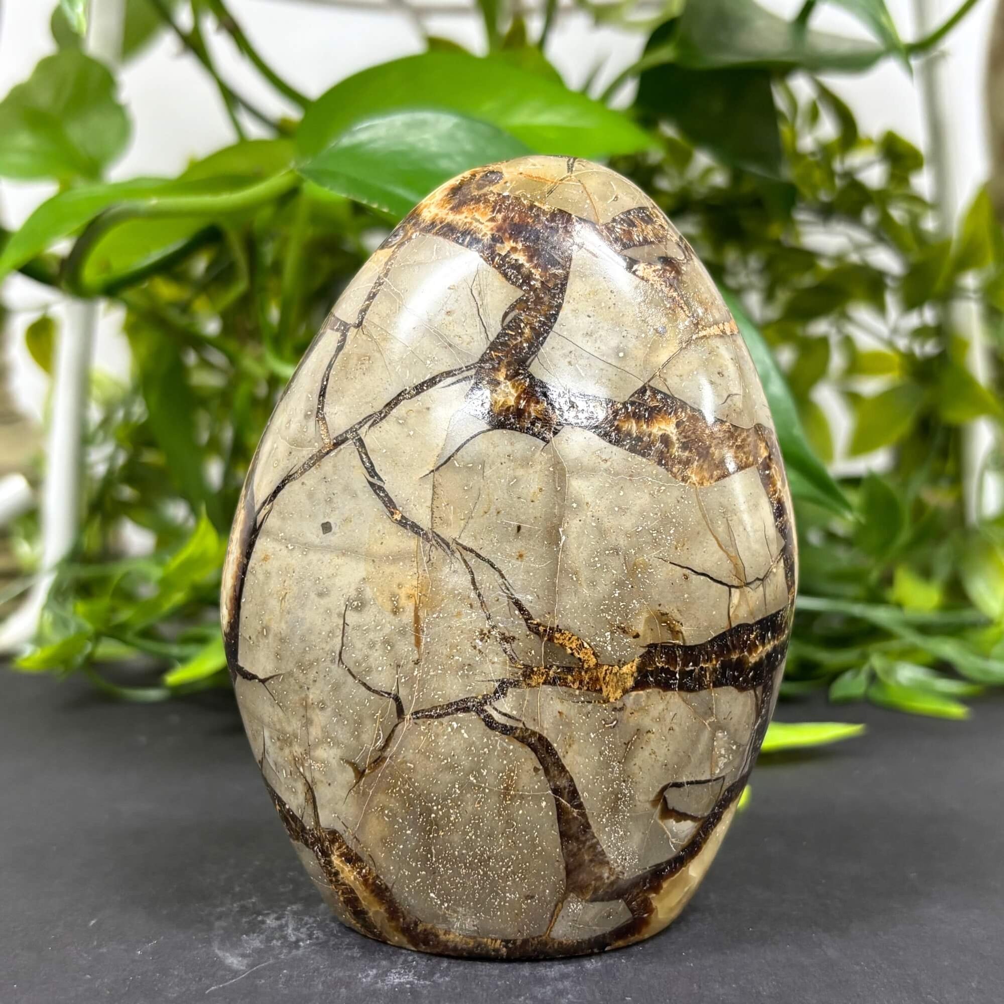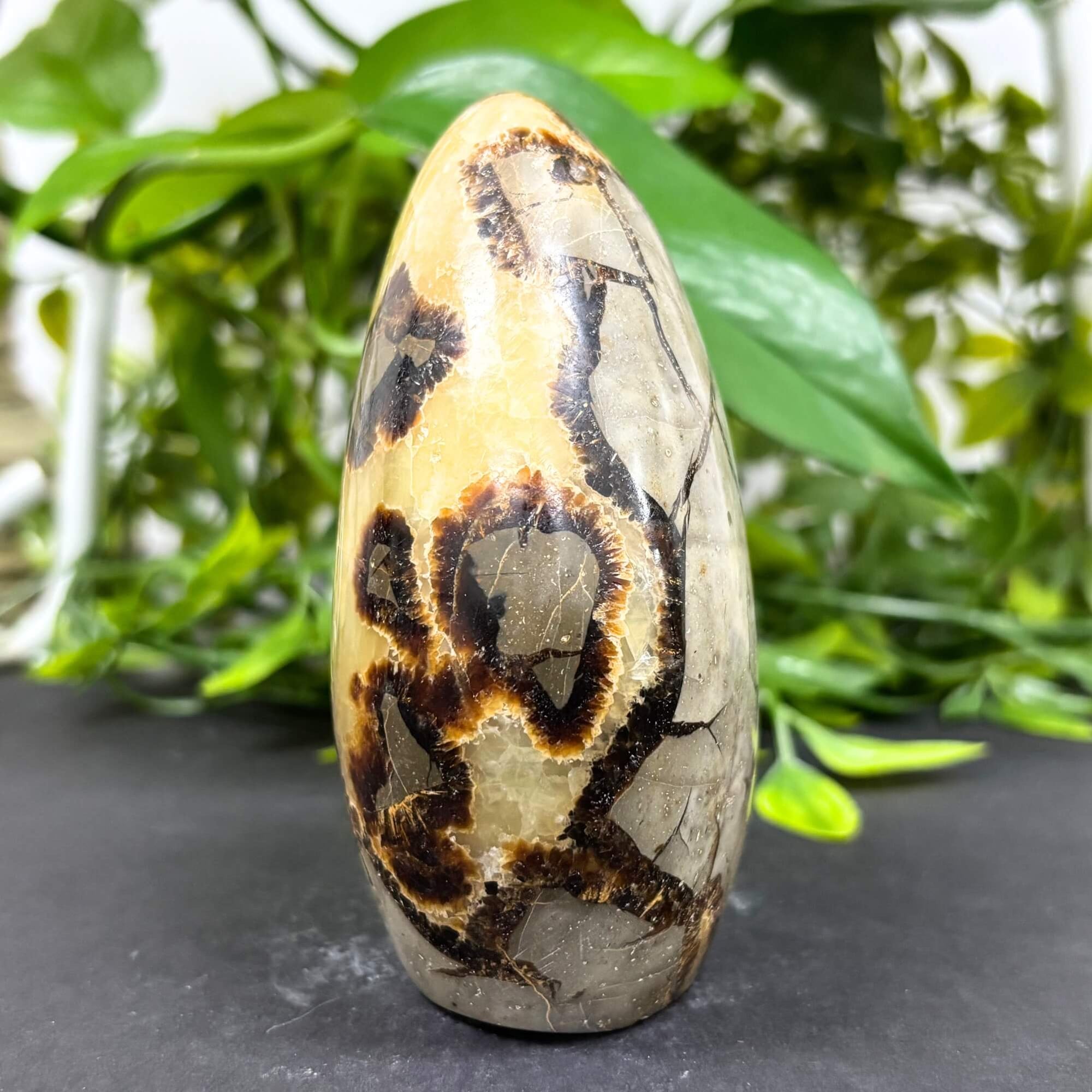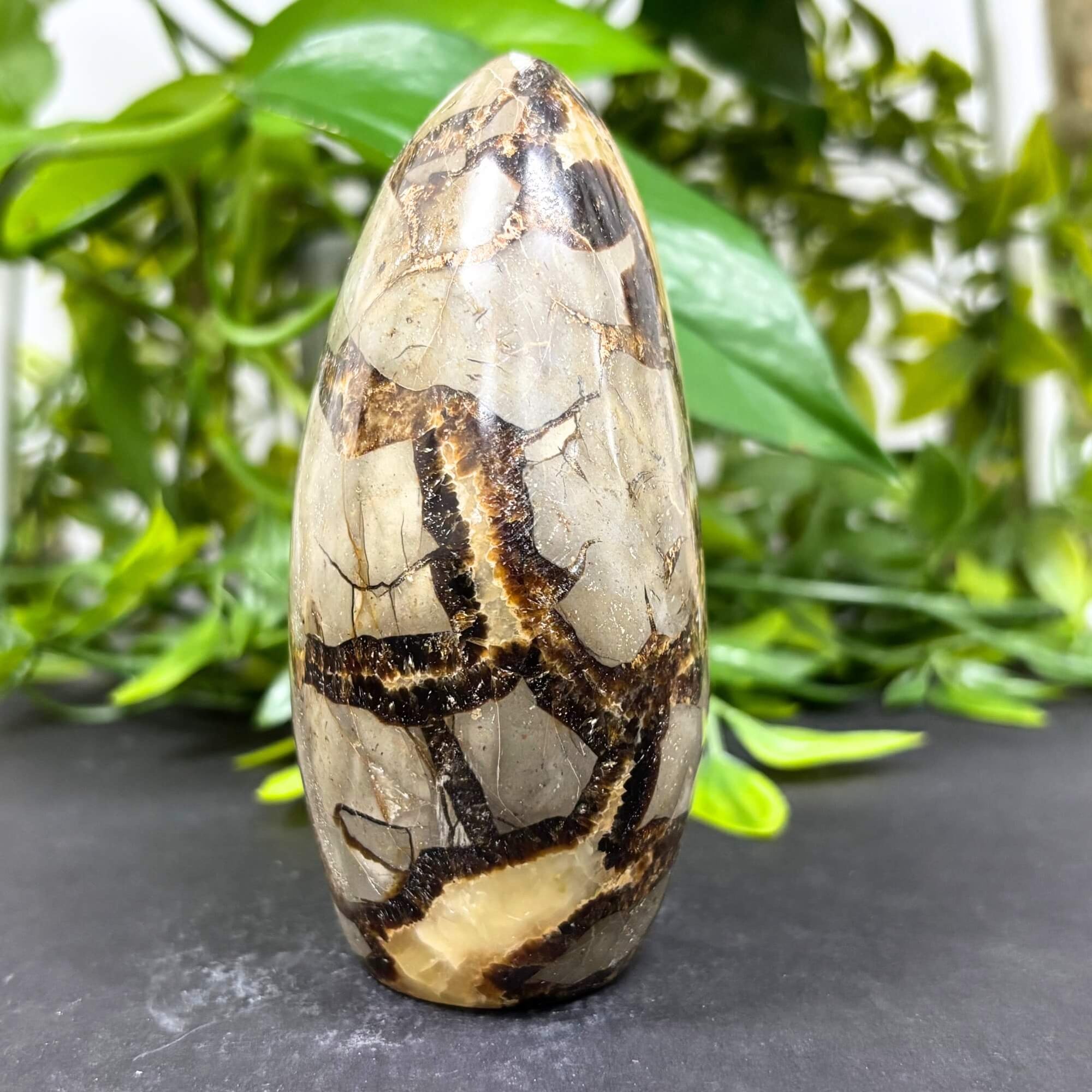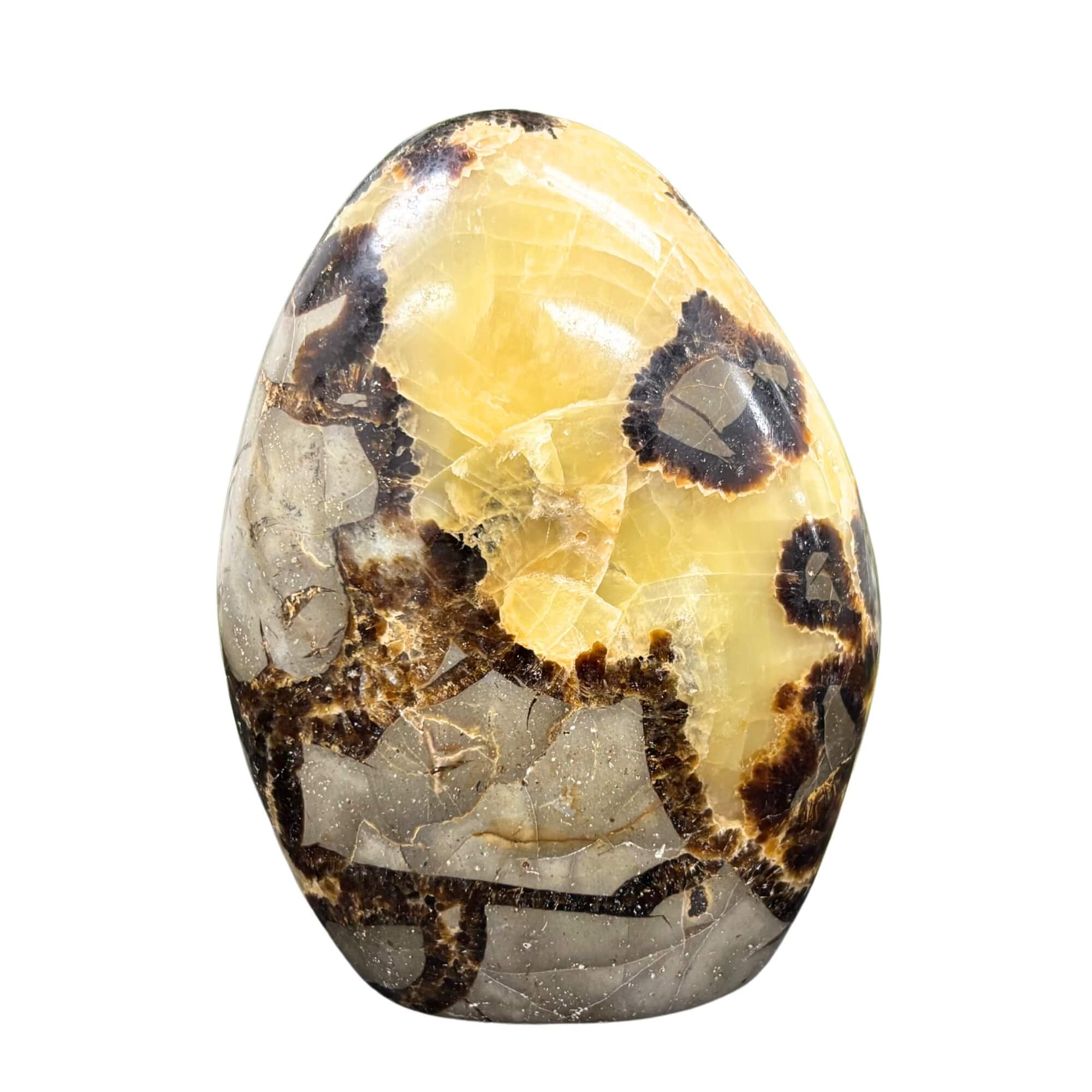 This septarian freeform from Madagascar is a visually striking stone that showcase a unique combination of earthy colors and natural geometric patterns. Formed millions of years ago, septarian is a blend of minerals—typically calcite, aragonite, and limestone—creating a bold mosaic of golden yellow, brown, and gray tones. Polished into a freeform shape, this piece highlights the stone’s natural cracks and separations, which resemble a dragon’s skin, earning it the nickname “Dragon Stone.”