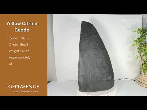 Handcrafted natural yellow citrine geode cluster from Brazil showcases a cathedral style quartz crystal formation. The piece measures 11.45 inches wide, 9 inches deep and 18.5 inches tall, weighing around 48 lbs, creating a striking focal point for any space.