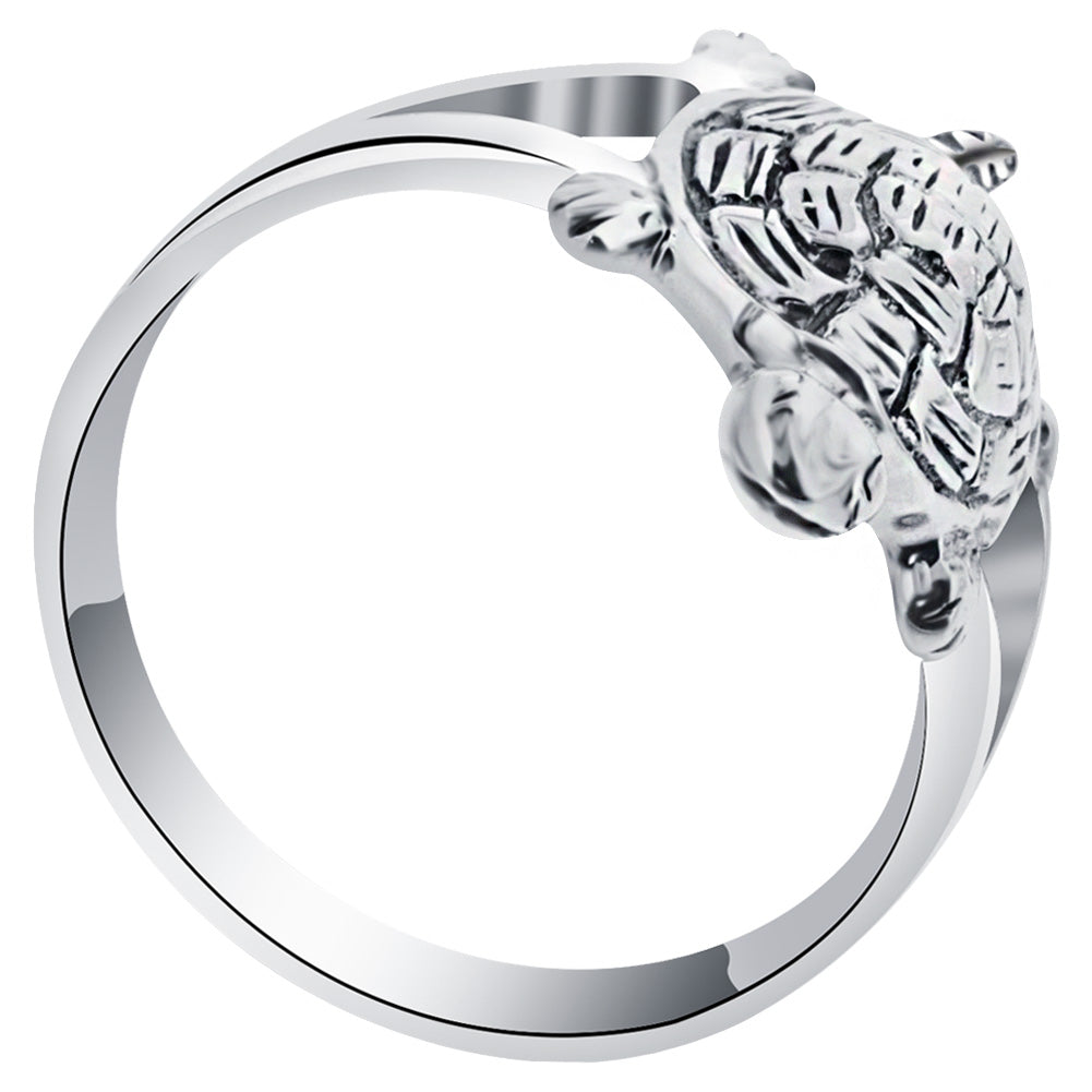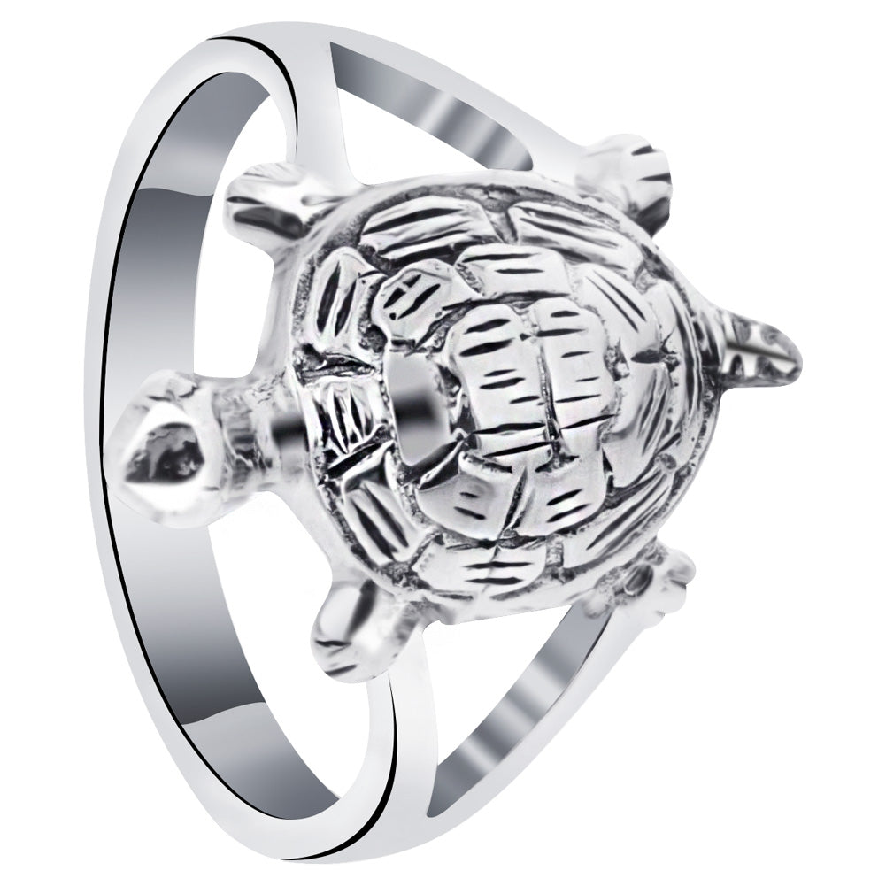 This tortoise ring is the best choice for any nature lover. Crafted with .925 sterling silver with an antique finish, the ring's splits near the tortoise feet to form a platform for where the tortoise rests. The tortoise shell is detailed and creates visual interest.