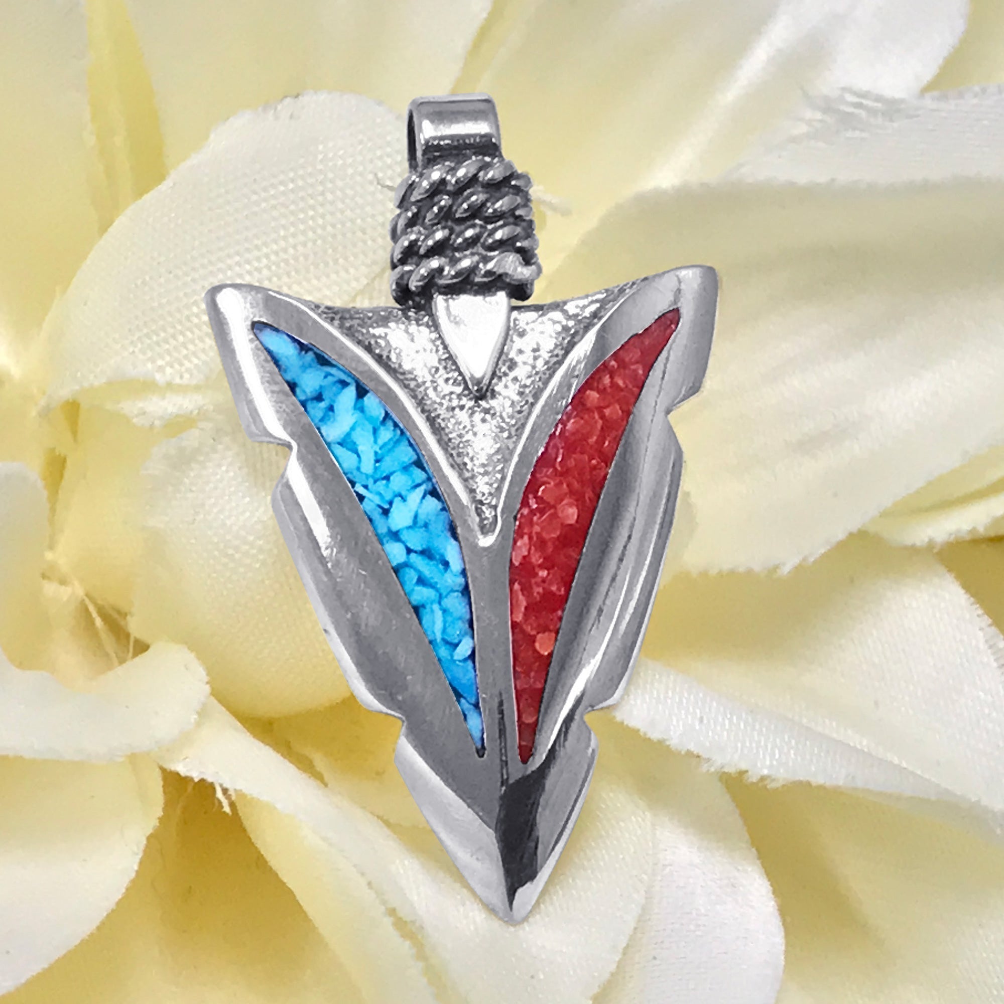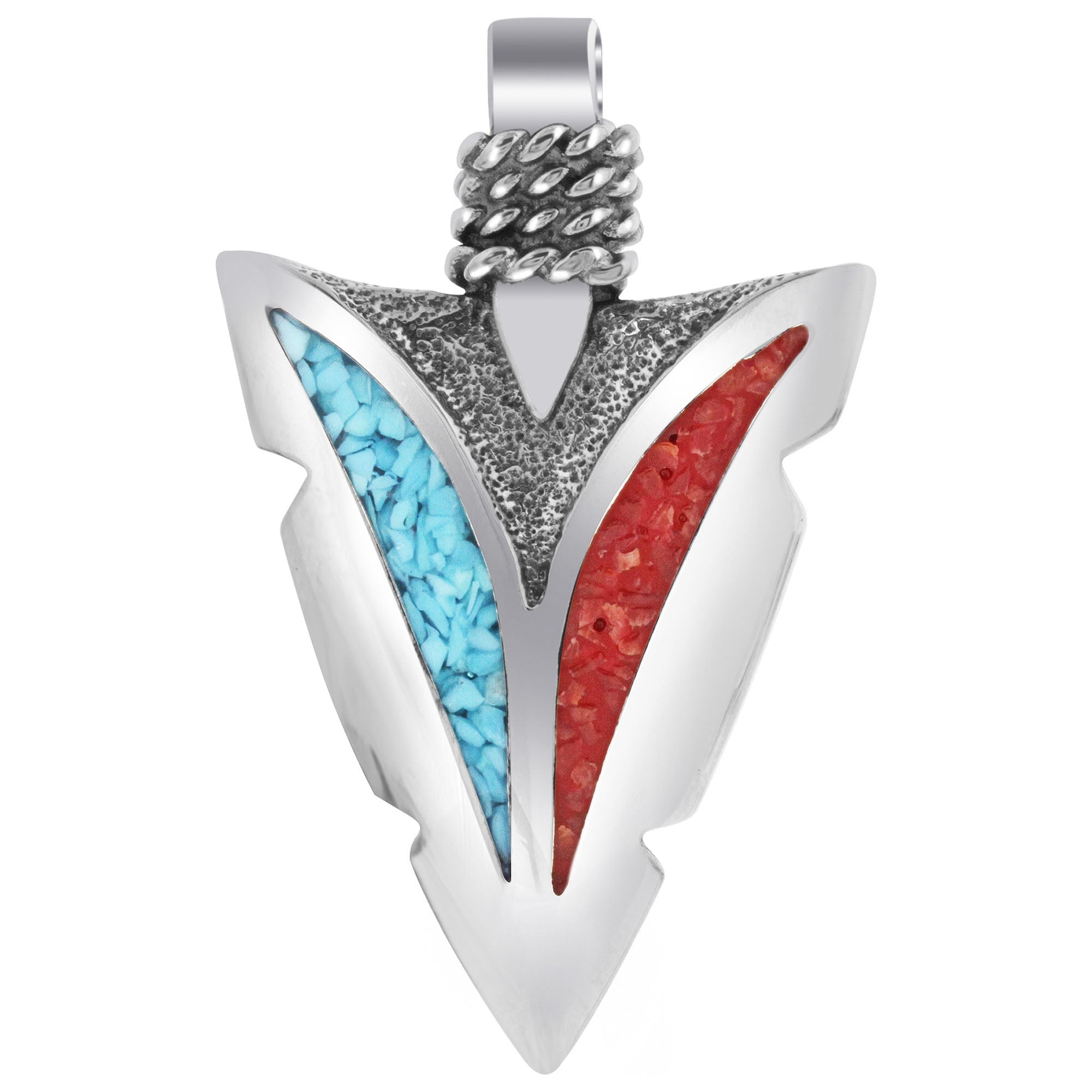 Enhance any necklace with this lovely 925 sterling silver Turquoise and Coral gemstone arrowhead pendant. The vibrant blue and orange within this pendant contrast each other beautifully and add a stunning pop of color to any outfit!. The height of this Pendant is 32mm and the Width is 20mm tapers down. Please visit our store for the chain to go with this pendant.